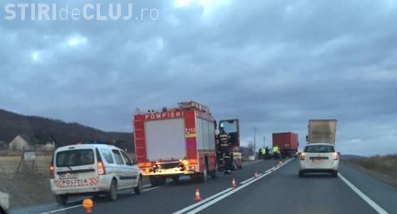 Accident cu două victime la ieșire din Gilău. Un șofer de TIR lovit în plin o mașină, după o depășire periculoasă FOTO