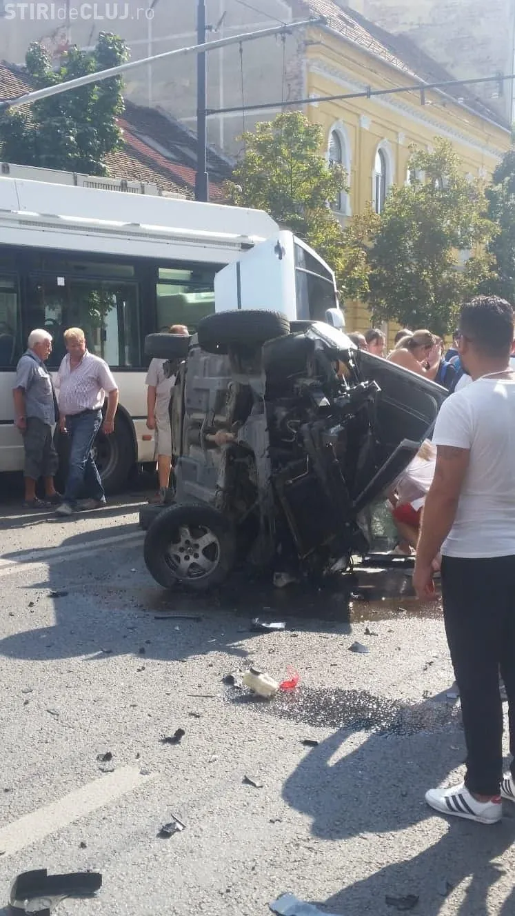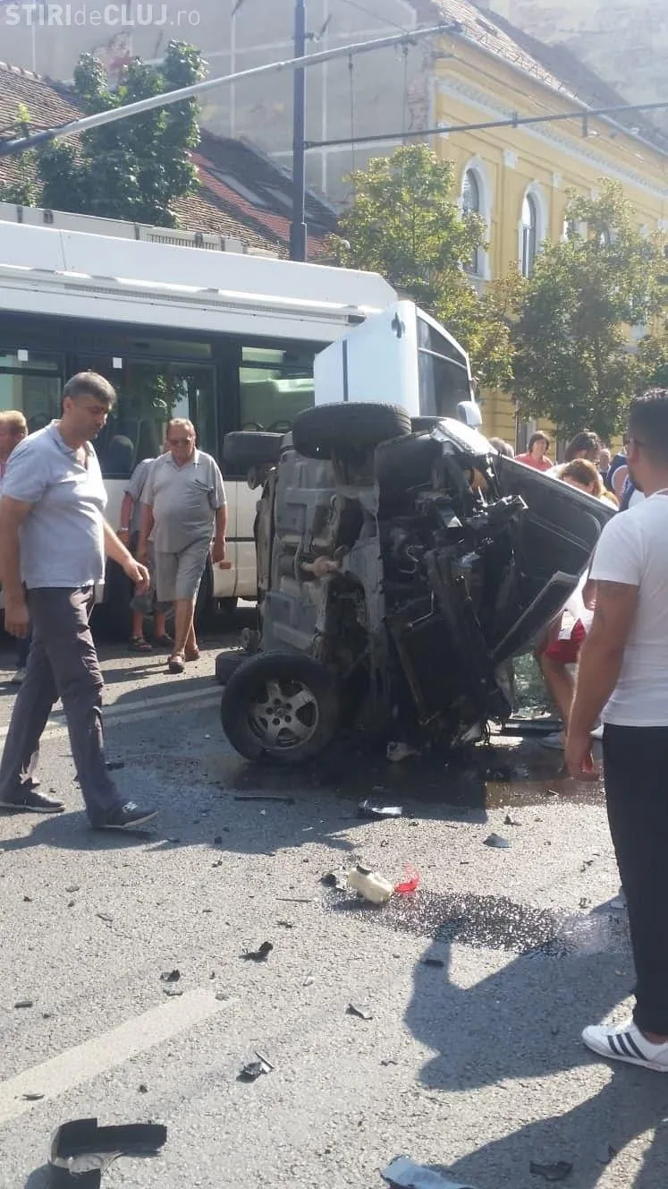 Accident cu victime în centrul Clujului. O mașină a fost răsturnată pe mijlocul drumului FOTO