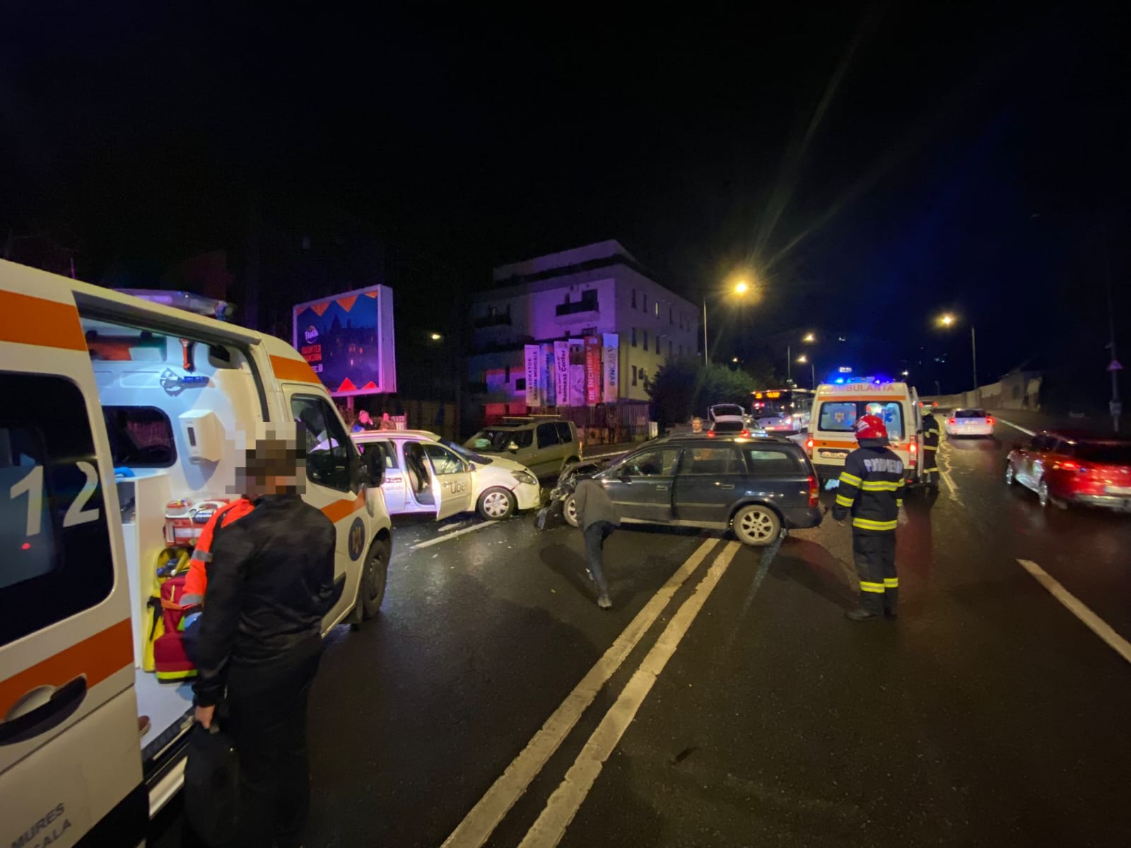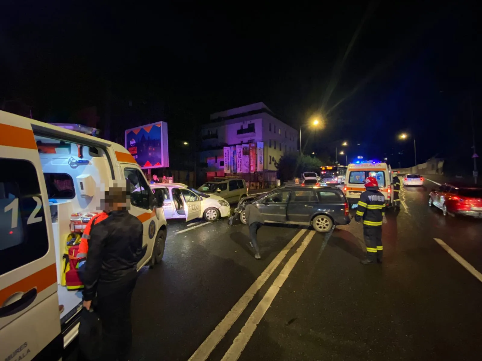 O femeie de aproximativ 45 de ani, conștientă și cooperantă, a fost evaluată de echipajul de la Serviciul de Ambulanță Județean și va fi cel mai probabil transportată la spital. La misiune iau parte o autospecială cu modul de descarcerare și două ambulanțe SAJ. Ceilalți șoferi implicați nu au fost răniți grav.