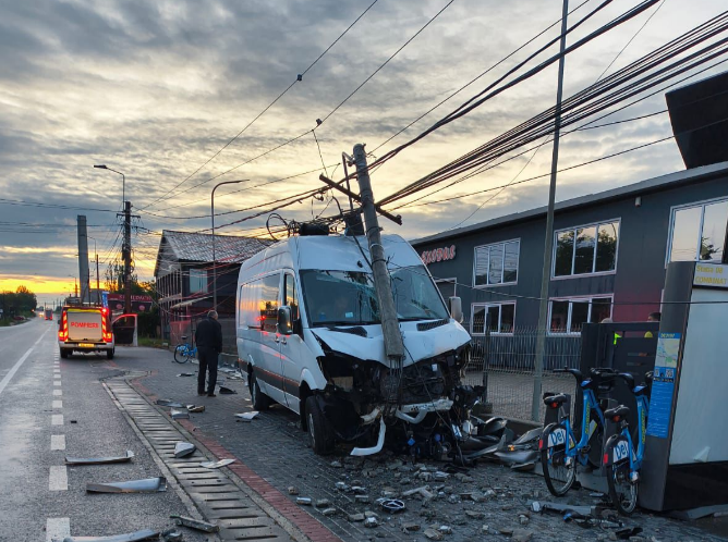 Accident dramatic pe strada Bistriței din Dej: o autoutilitară a spulberat o stație de biciclete și a rupt un stâlp de electricitate