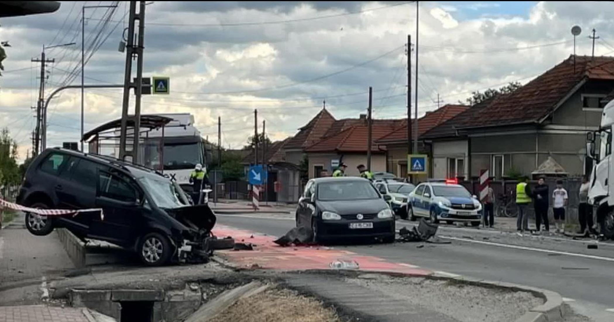 În urma impactului, elemente din caroseria celor două vehicule au ricoșat într-un autoturism aflat în deplasare.