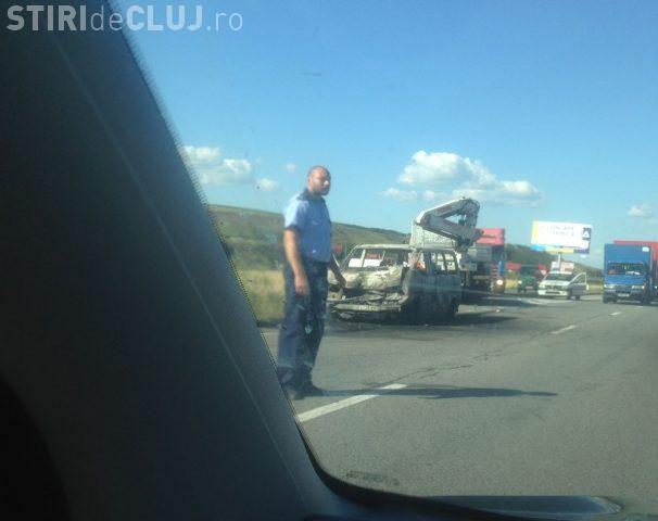 În urma impactului, un microbuz implicat in accident a luat foc, fiind mistuit in totalitate de flacari, scrie dejeanul.ro.