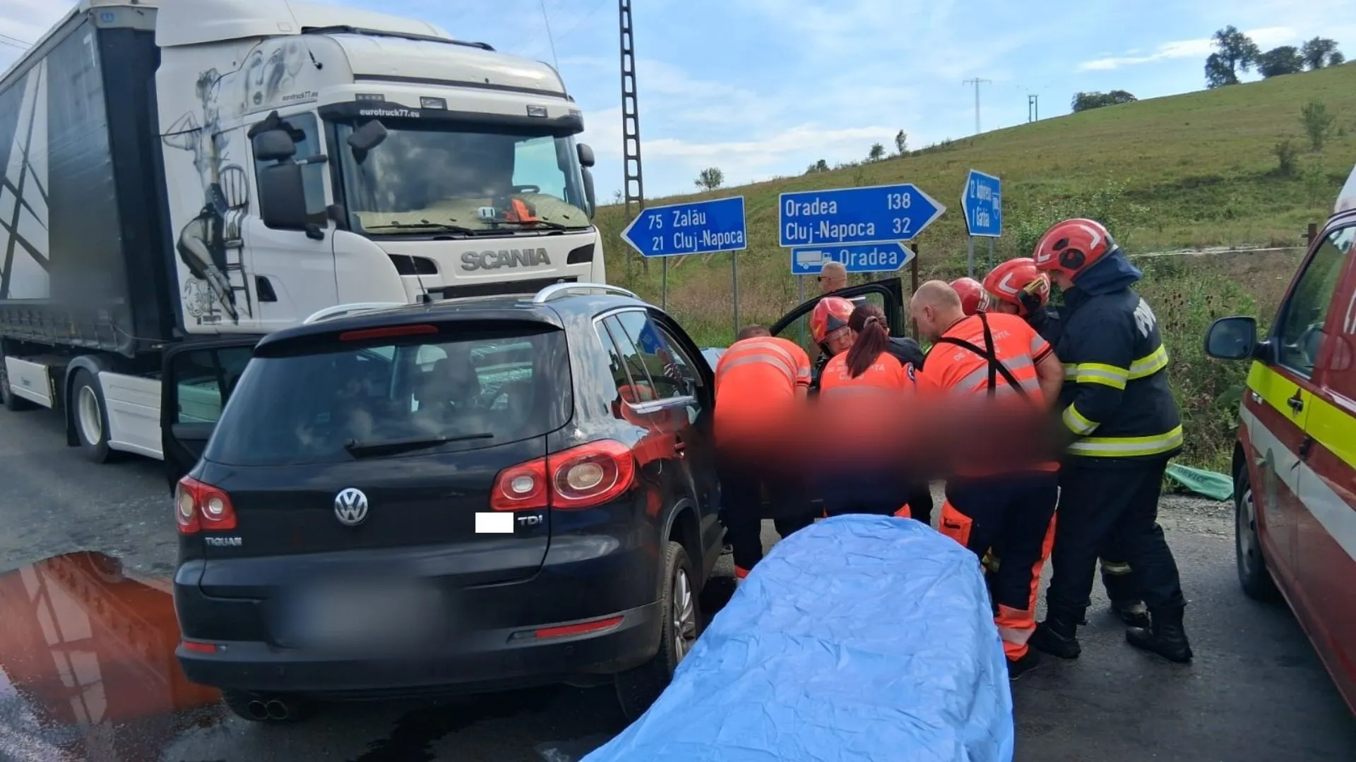 Accident grav în Cluj: Un TIR și o mașină, implicate într-un impact violent. Două persoane au fost încarcerate și ulterior duse la spital