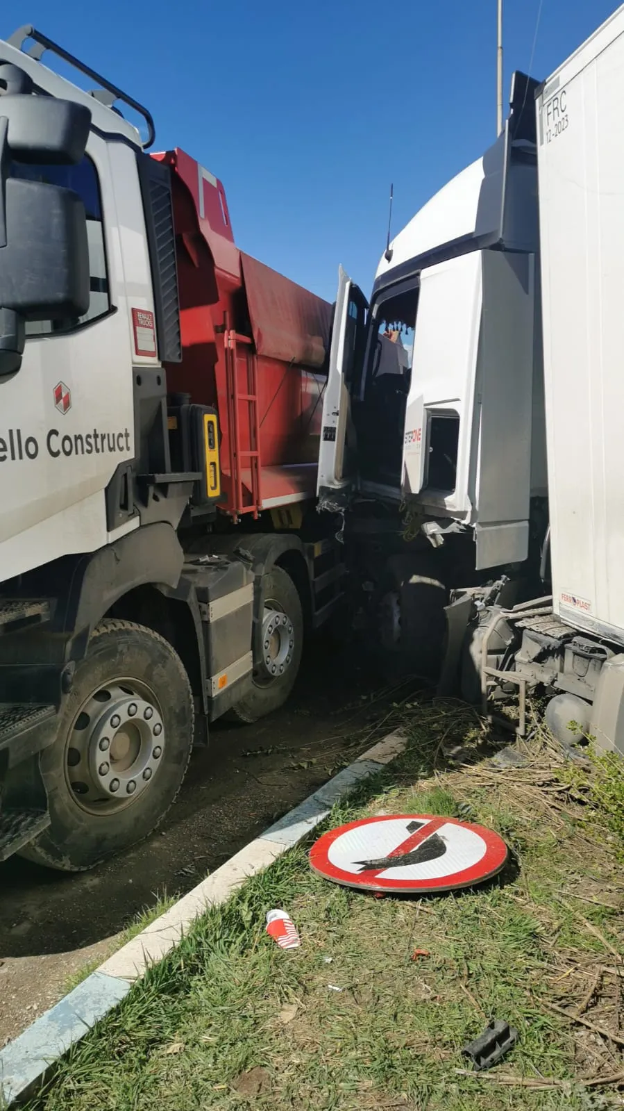 Unul dintre TIR-urile implicate în accident a ricoșat într-o bascula și a strivit un autoturism.