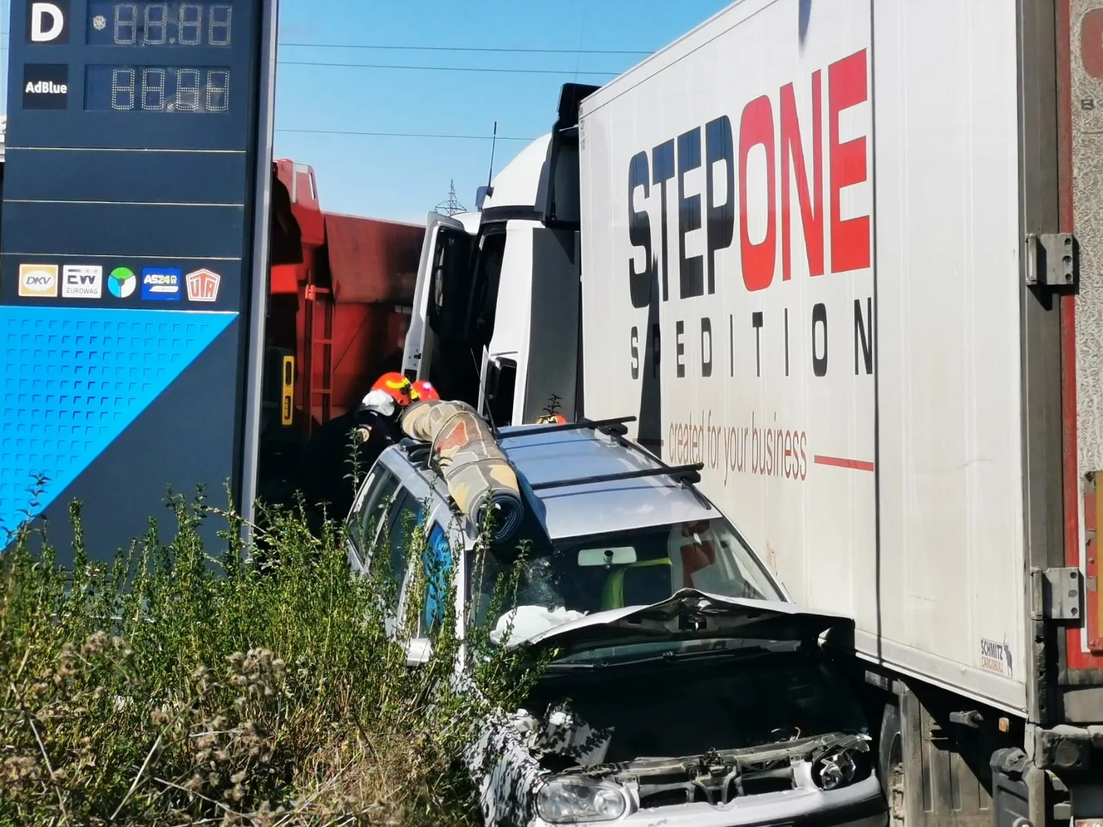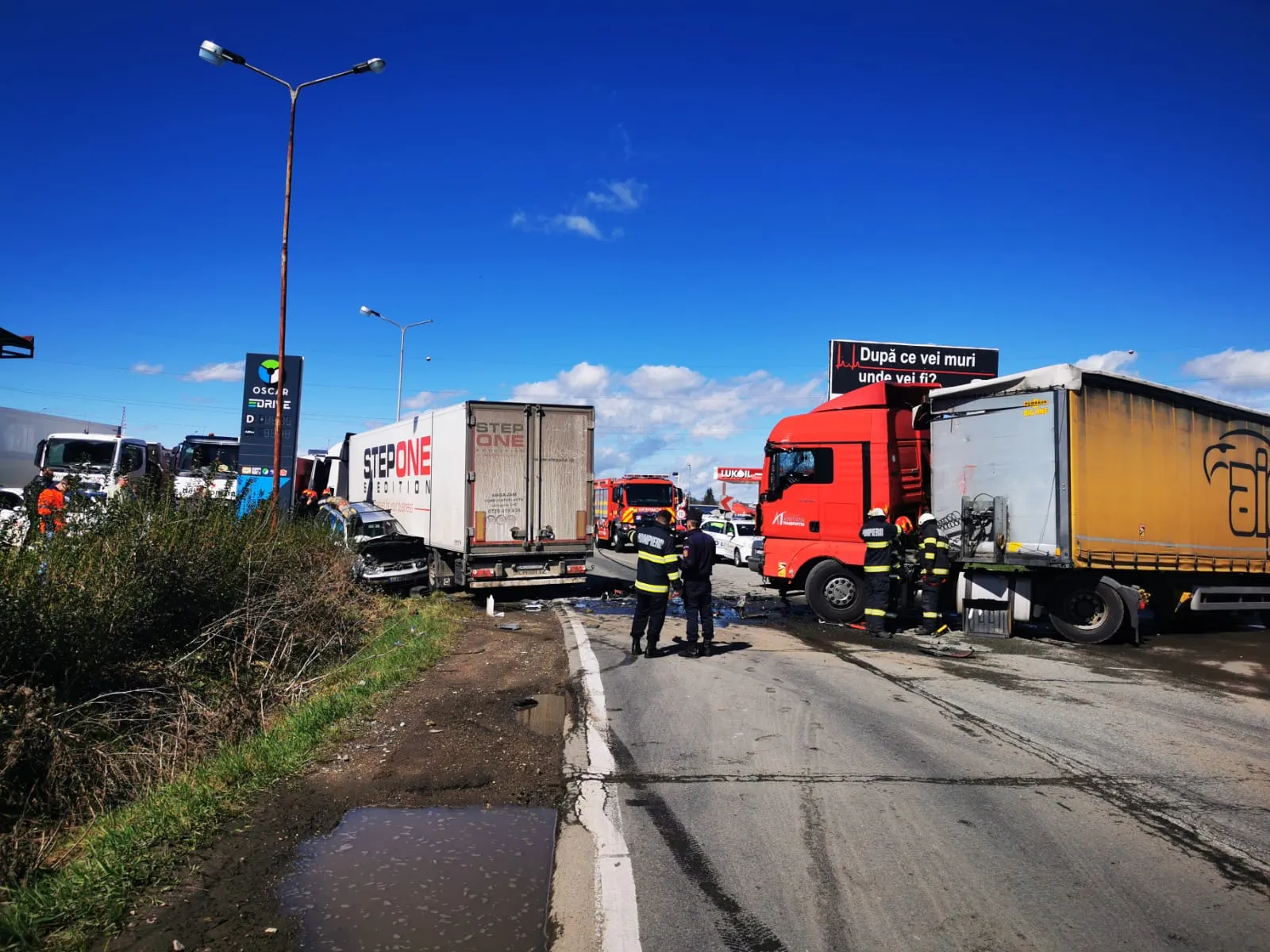„Din primele date, în accident au fost implicate două autotrenuri și două autoturisme. Nu au existat victime încarcerate, însă 4 persoane sunt evaluate de către echipajele medicale.