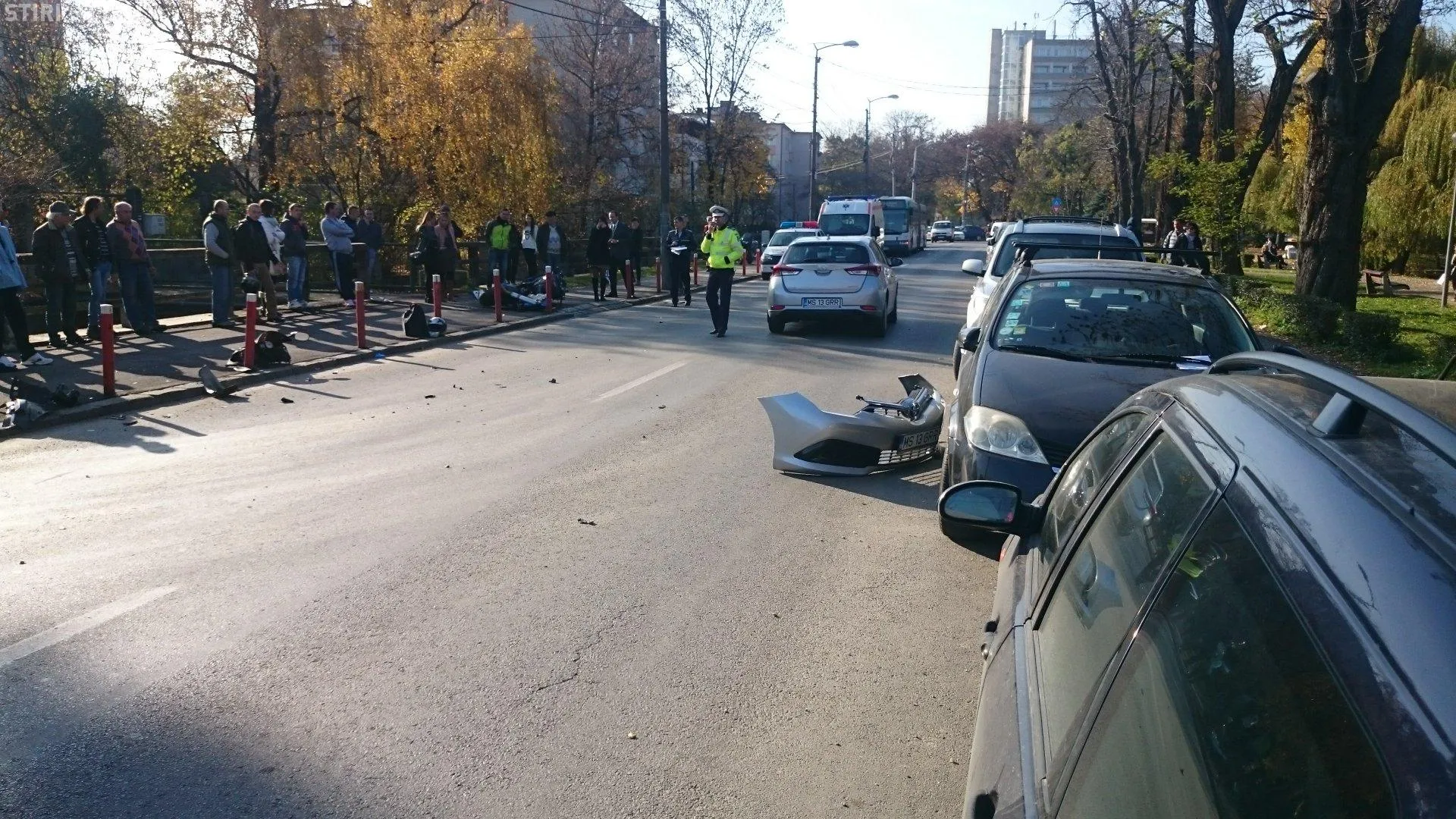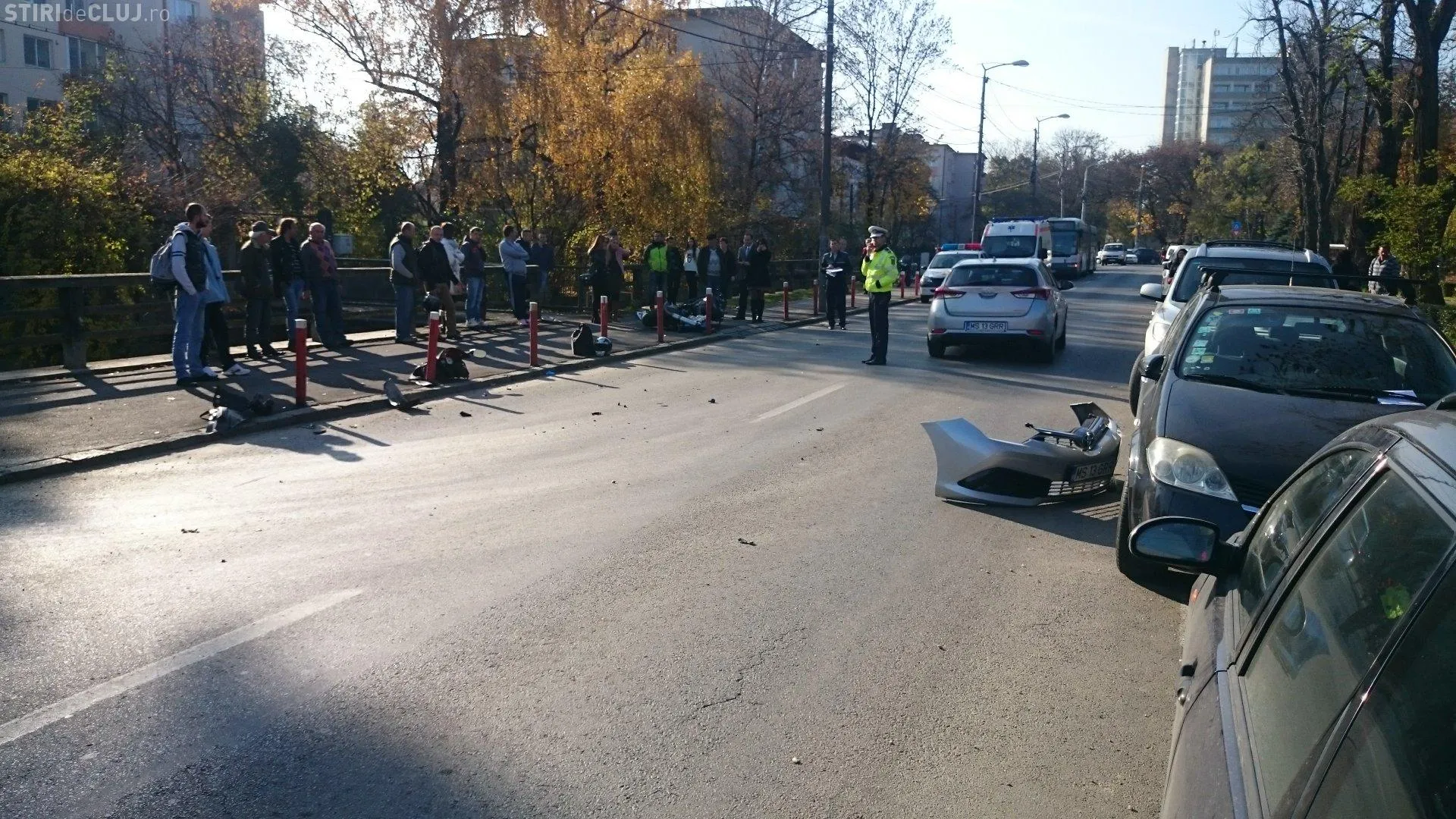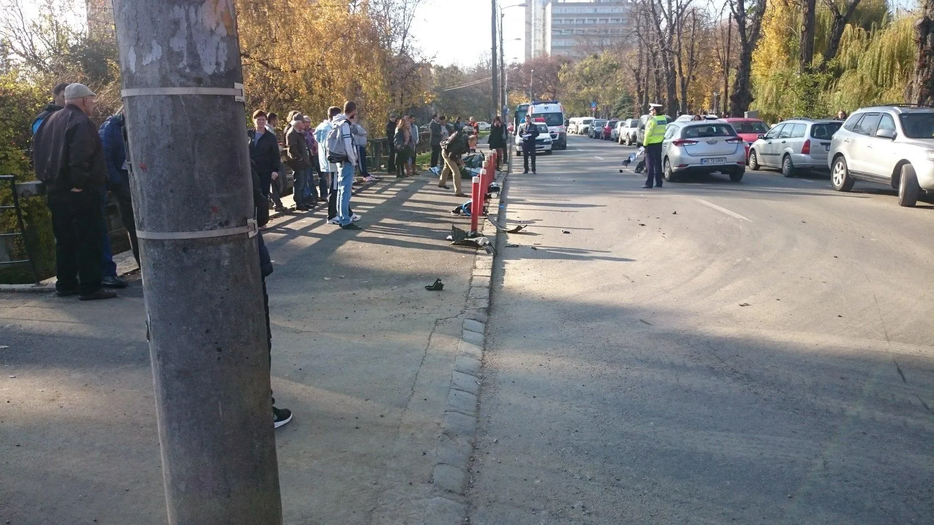Motociclista a fost rănită grav și a fost transportată la UPU. Conform martorilor, femeia de pe motocicletă a lovit autoturismul, iar apoi a ricoșat în stâlpii de pe marginea drumului, impactul fiind violent.
