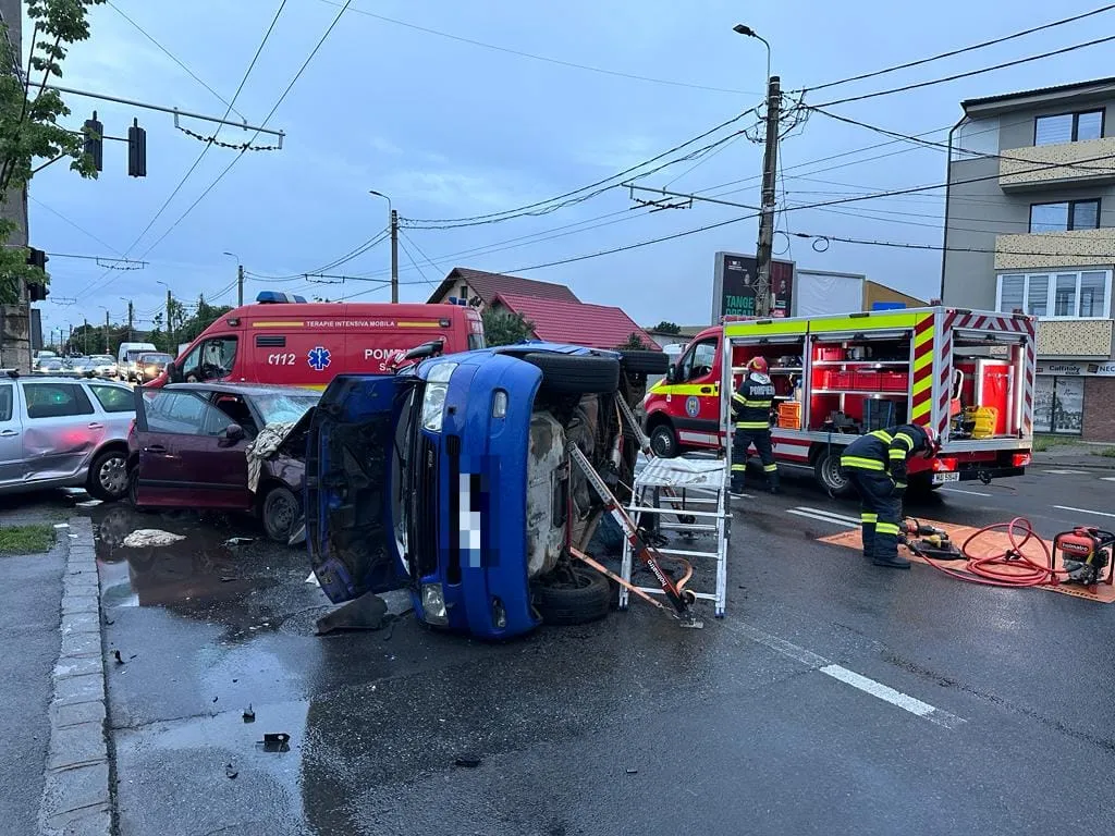 Pompierii de la Detașamentul 1 Cluj-Napoca au intervenit la acest accident rutier petrecut pe strada Traian Vuia.