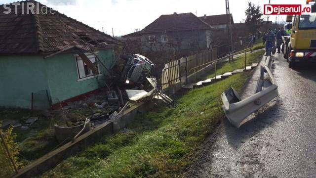 Accident grav pe un drum din Cluj. Un șofer a ”zburat” cu Mercedesul într-o casă FOTO