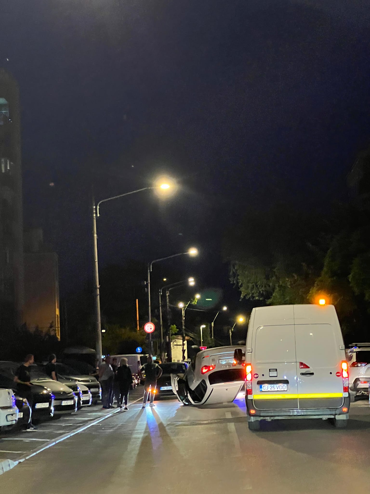 Potrivit martorilor oculari, șoferul a pierdut controlul volanului în timp ce conducea pe strada Donath, una dintre străzile principale ale cartierului clujean. Impactul a fost atât de puternic, încât mașina a rămas efectiv cu roțile în sus. Se pare că a lovit cel puțin încă o mașină în momentul răsturnării, o Toyota parcată în zonă, al cărui șofer este căutat acum de polițiști.