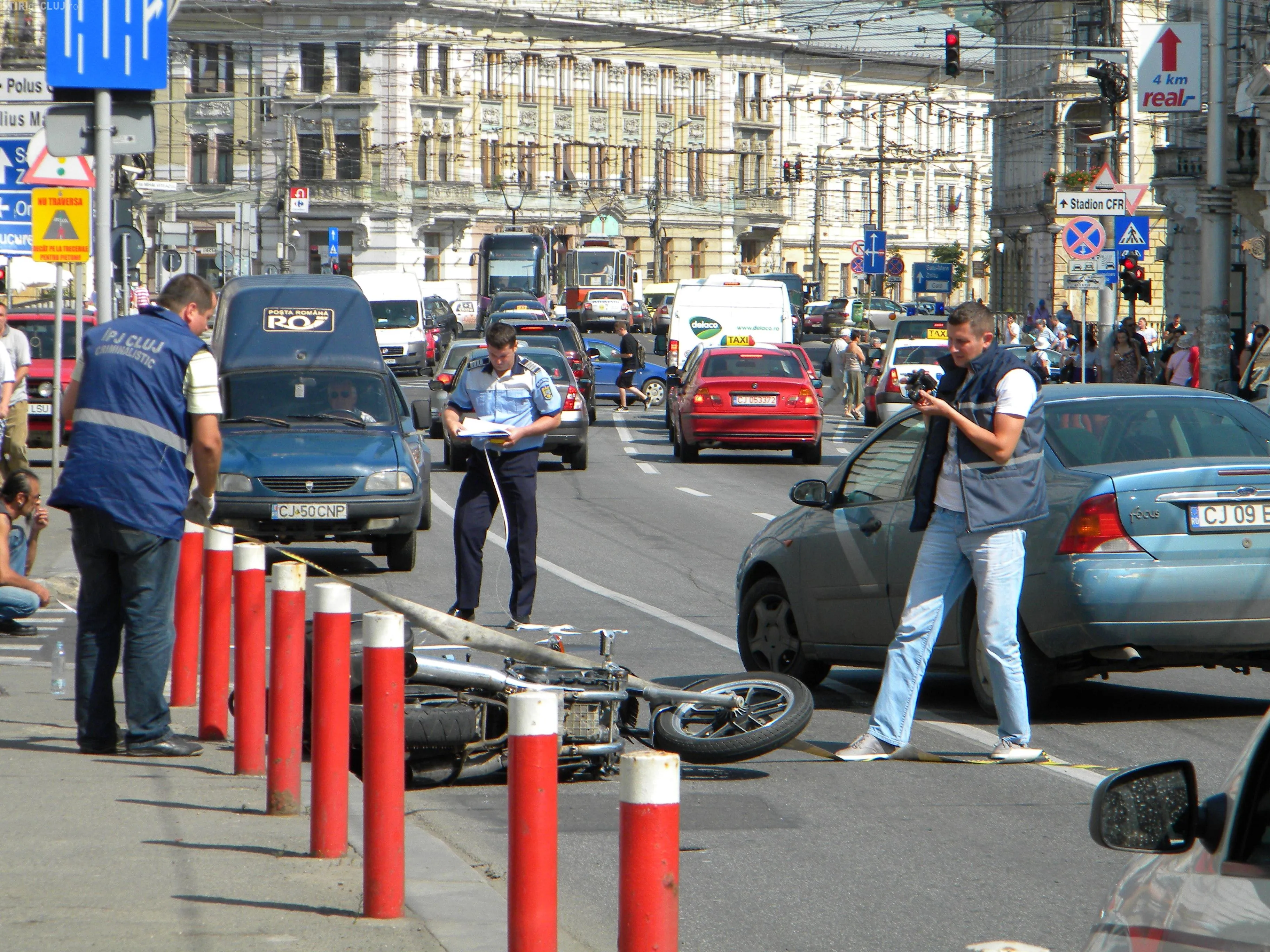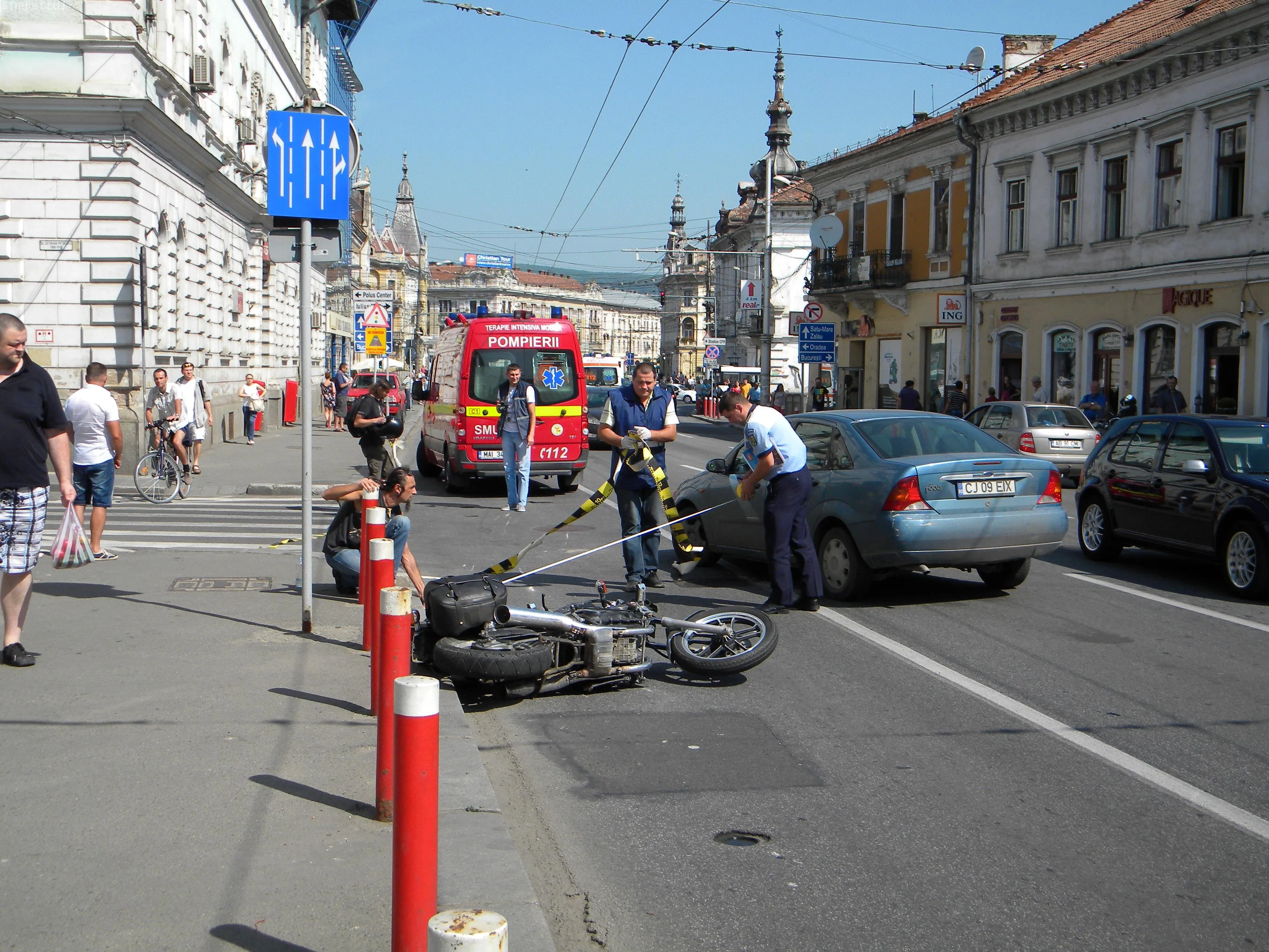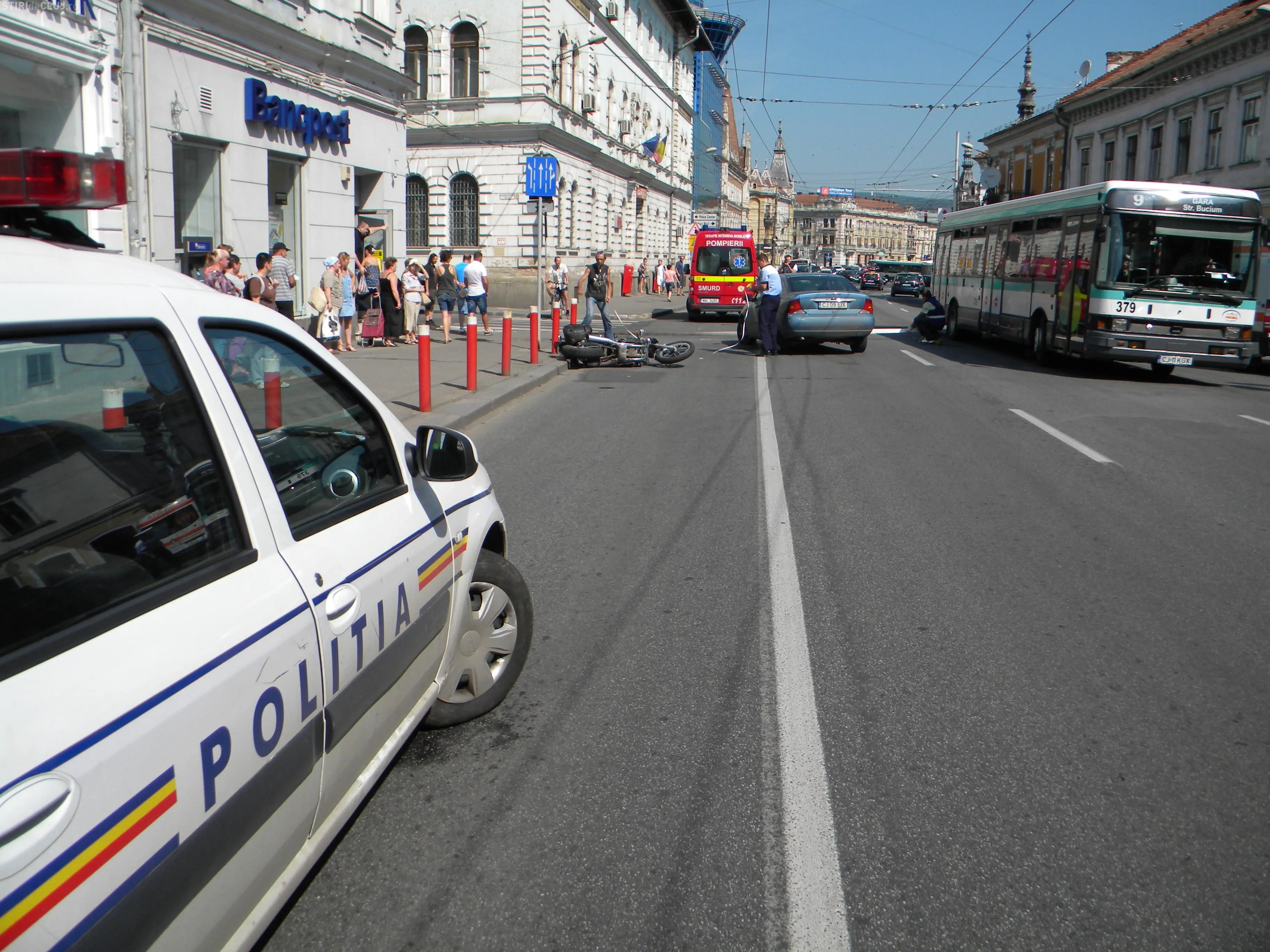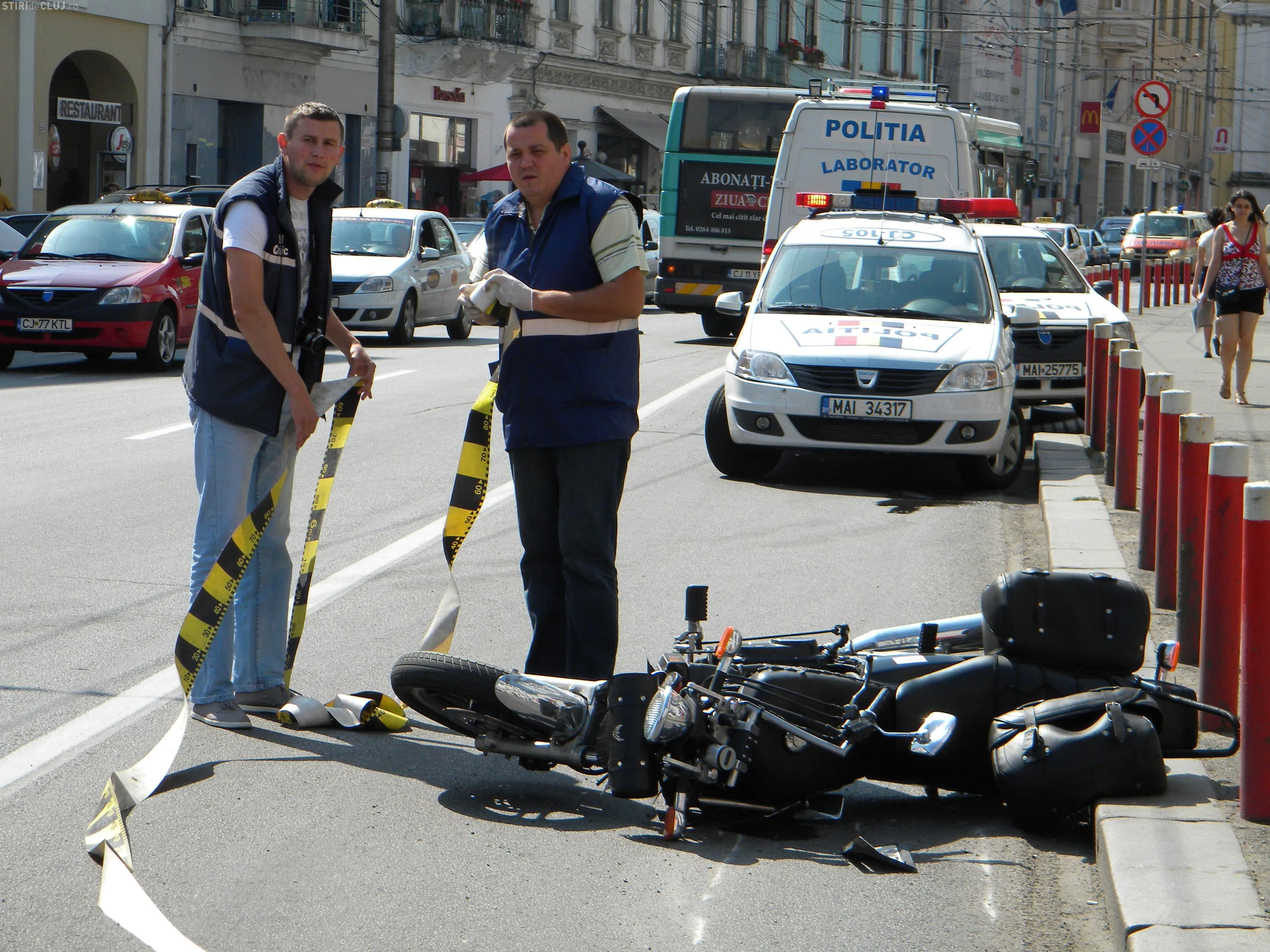 Conform polițiștilor prezenți la locul accidentului, șoferul unui autoturism marca Ford, care se deplasa dinspre Piața Unirii spre Central, a încercat să vireze stânga, ignorând linia coninută, și a lovit un motociclist care circula regulamentar.