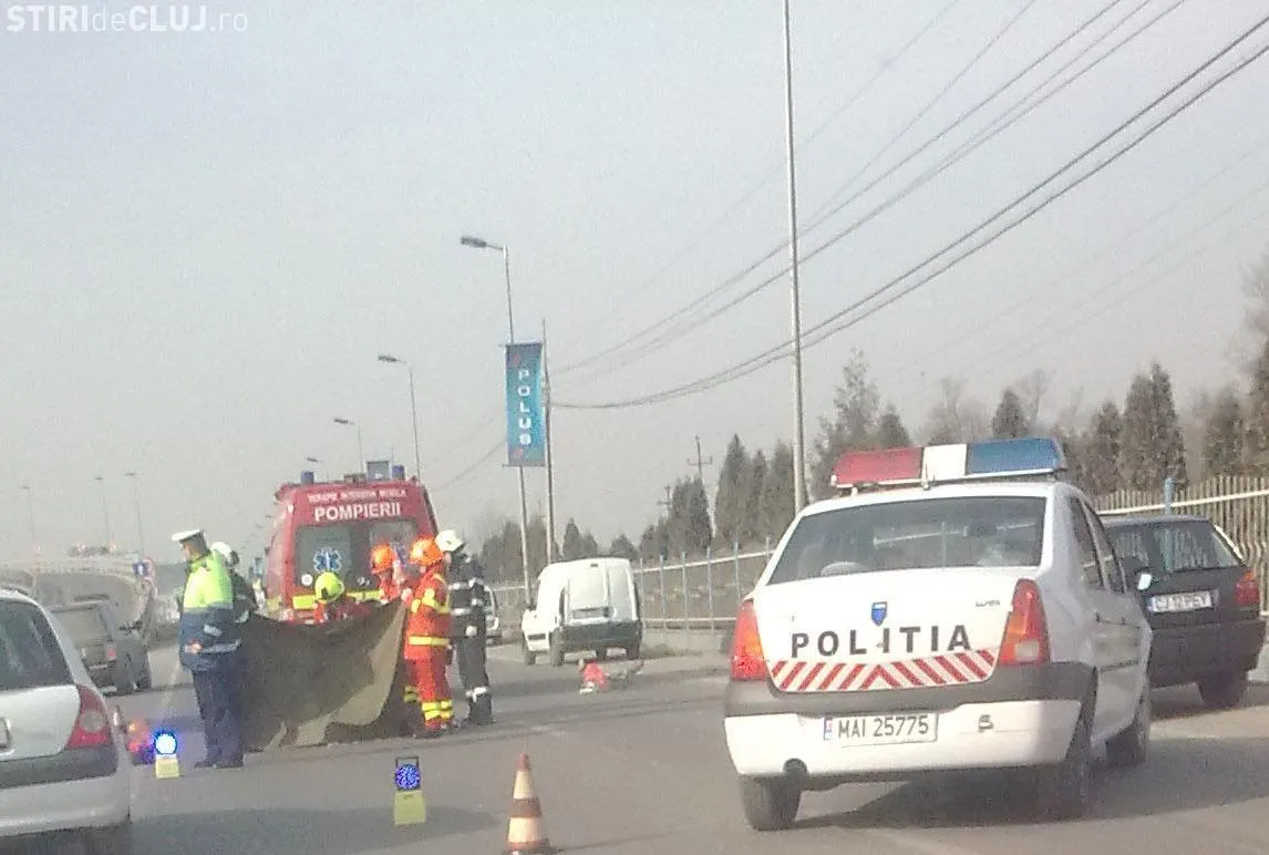 "Accidentul s-a produs in jurul orei 14.30. Un motociclist care iesea din centrul comercial a fost lovit in plin de un alt autoturism", a declarat purtatorul de cuvant al IPJ Cluj, Anca Purdea.