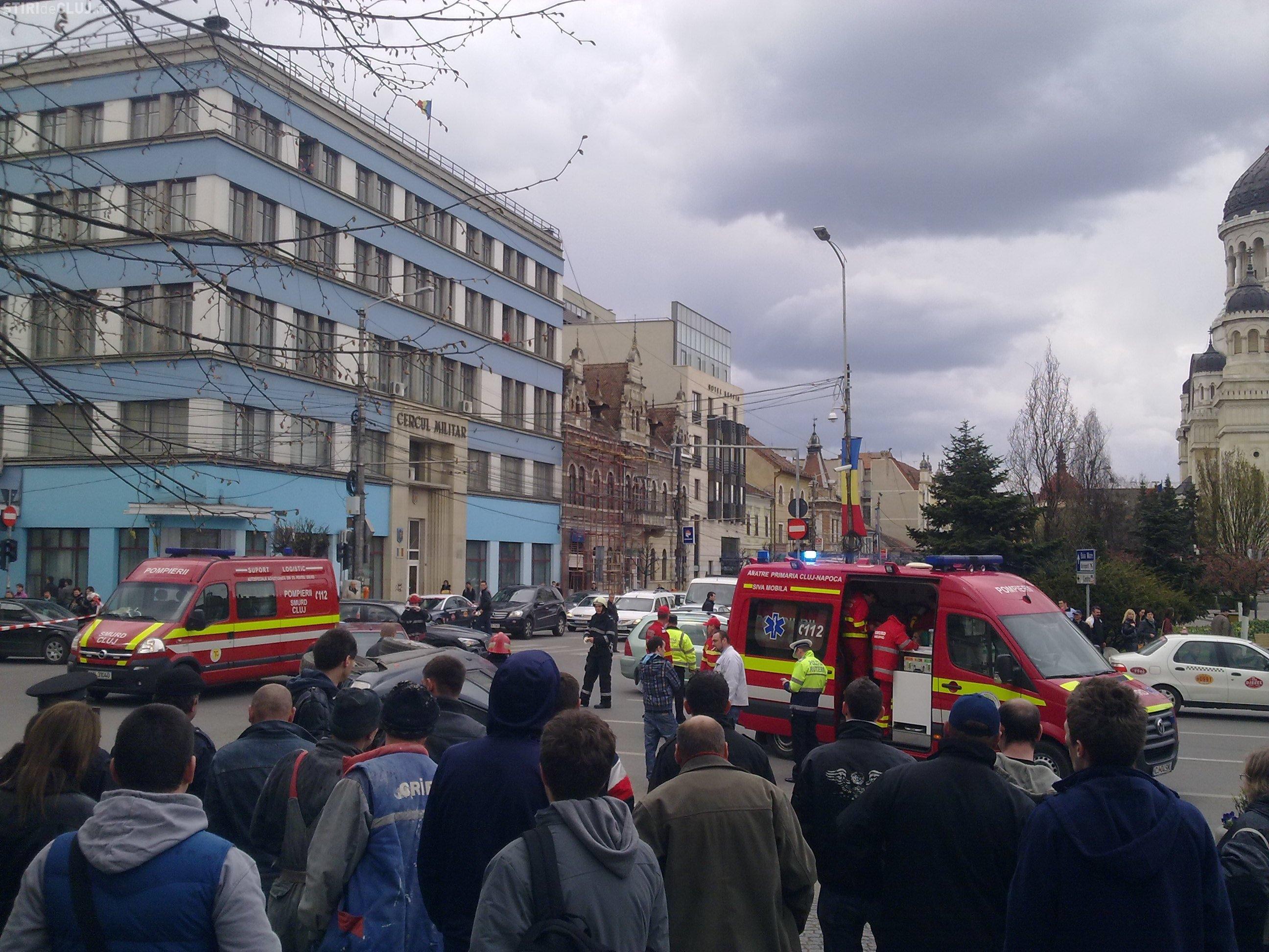 Accidentul din fata Teatrului National din Cluj a fost surprins la cateva minute dupa producere de Alin. In imagini se vad pompierii si echipajele SMURD care acorda ingrijiri medicale ranitilor.