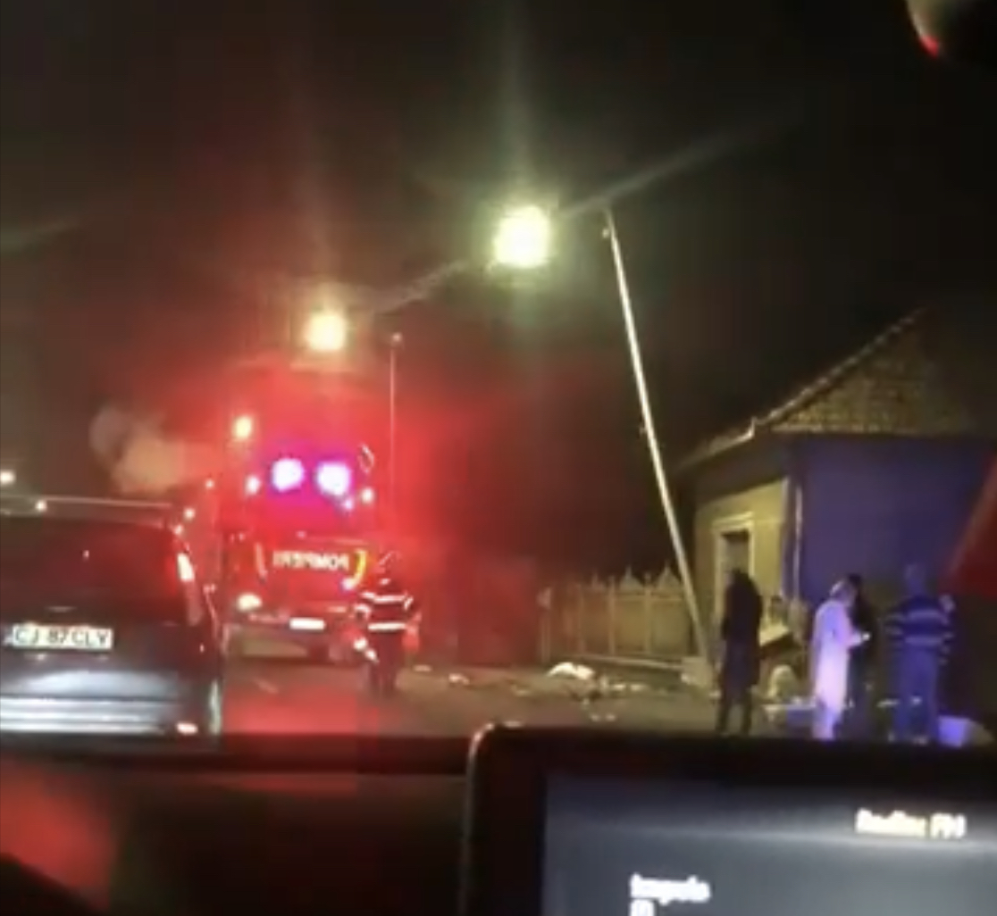 Una dintre masini a rupt un stâlp si poarta unei case.