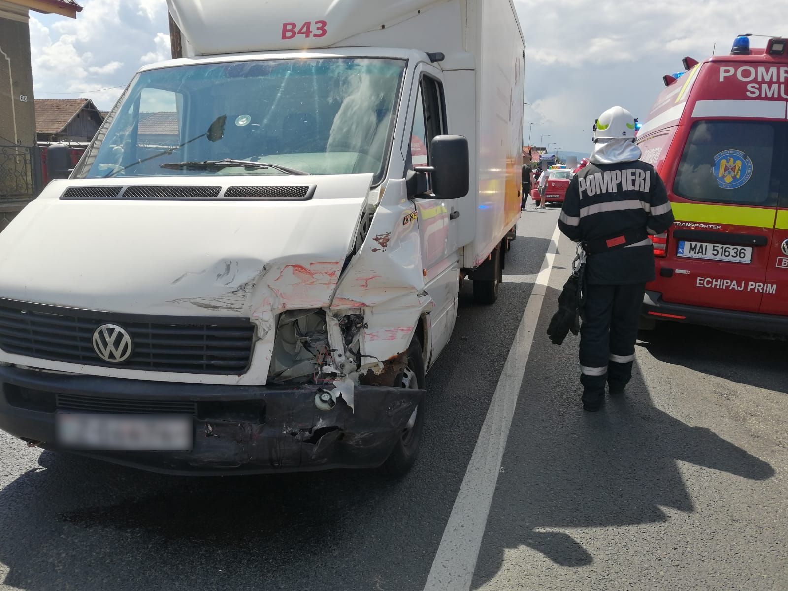 Pompierii sosiți la locul accidentului au găsit patru autovehicule avariate, dintre care unul avea portiera blocată, iar șoferul nu putea să iasă din vehicul.