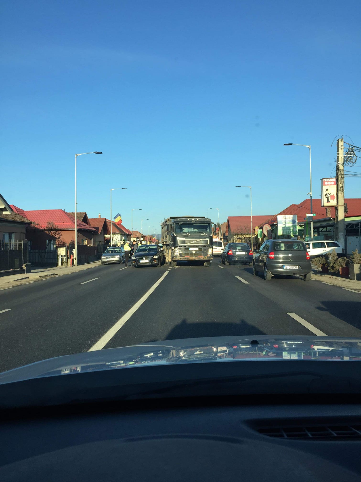 O basculantă nu a respectat distanța regulamentară în trafic și a lovit un autoturism care se afla în fața sa.