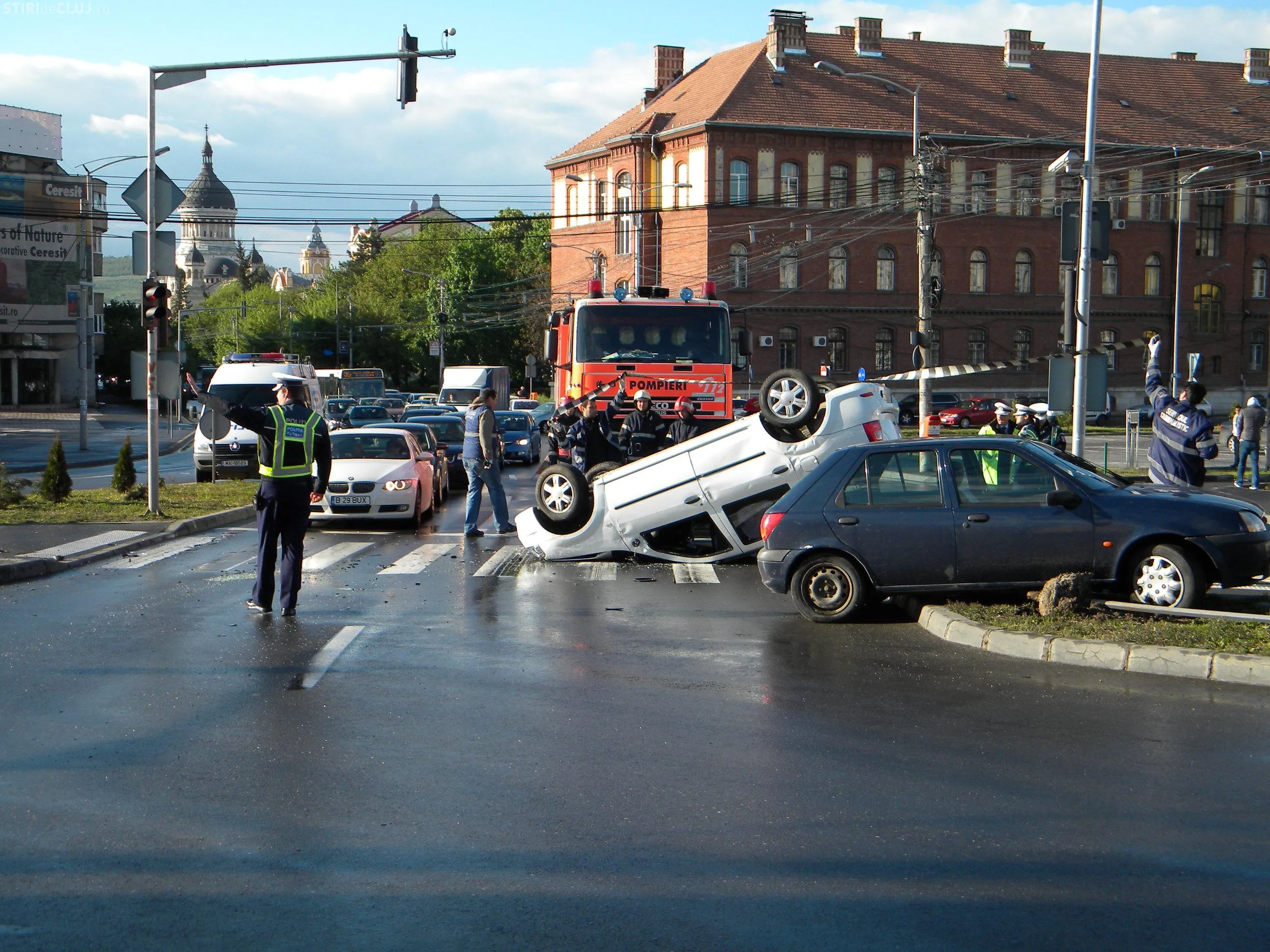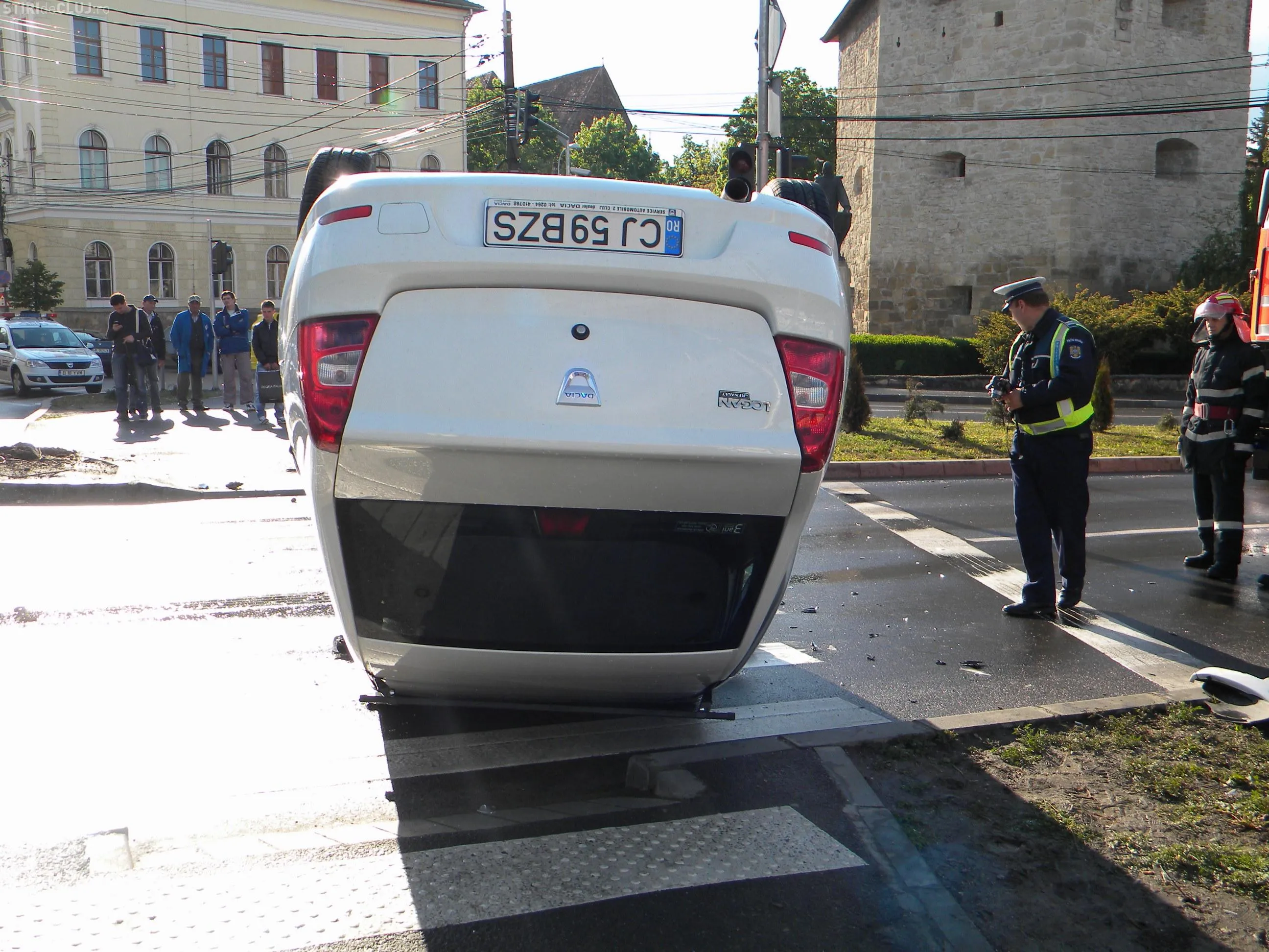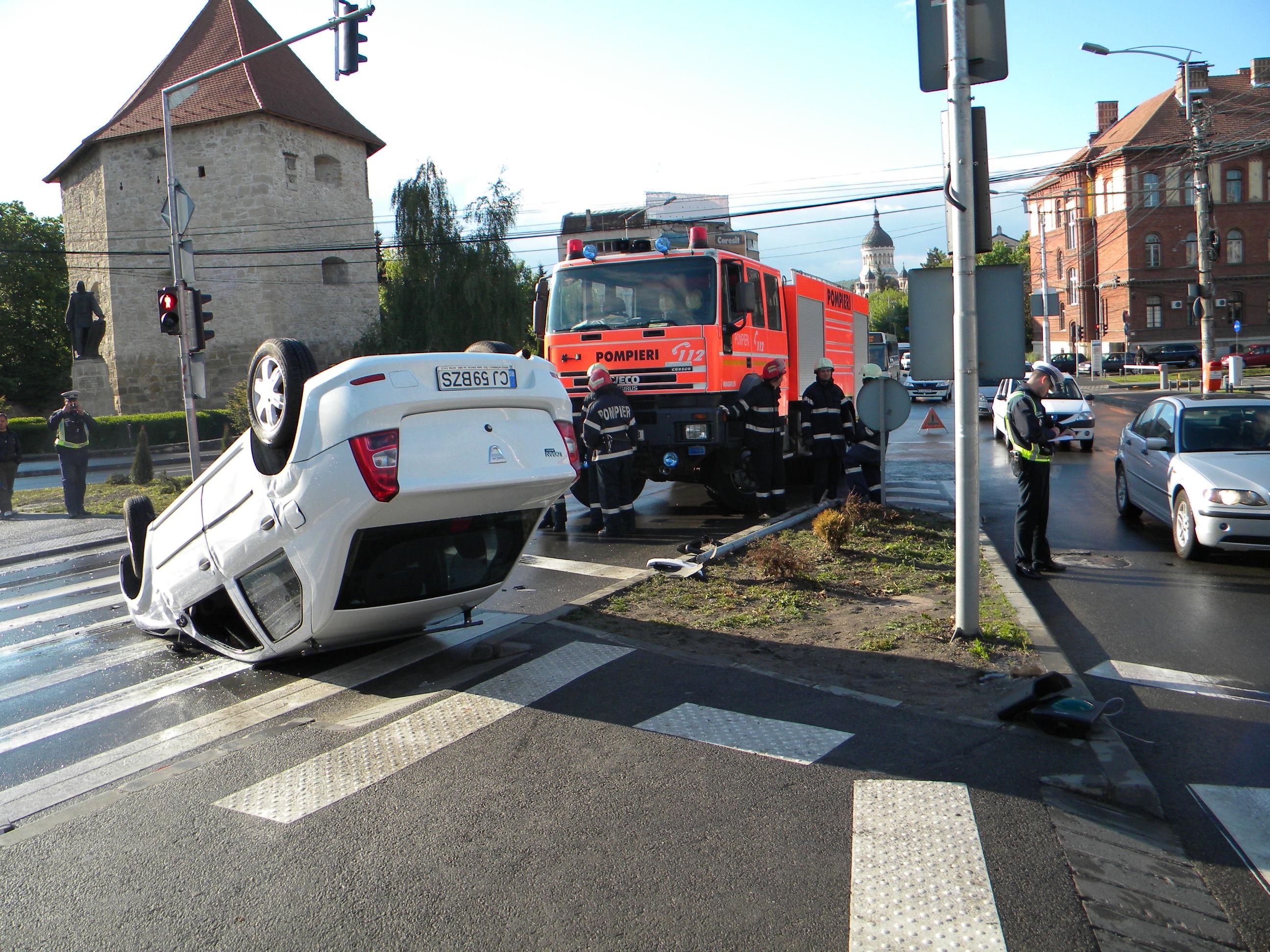 Doua masini au fost implicate intr-un spectaculos accident produs in jurul orei 18.00 in Piata Baba Novac. Una dintre masini s-a rasturnat si a spulberat un semafor. O persoana a fost ranita.