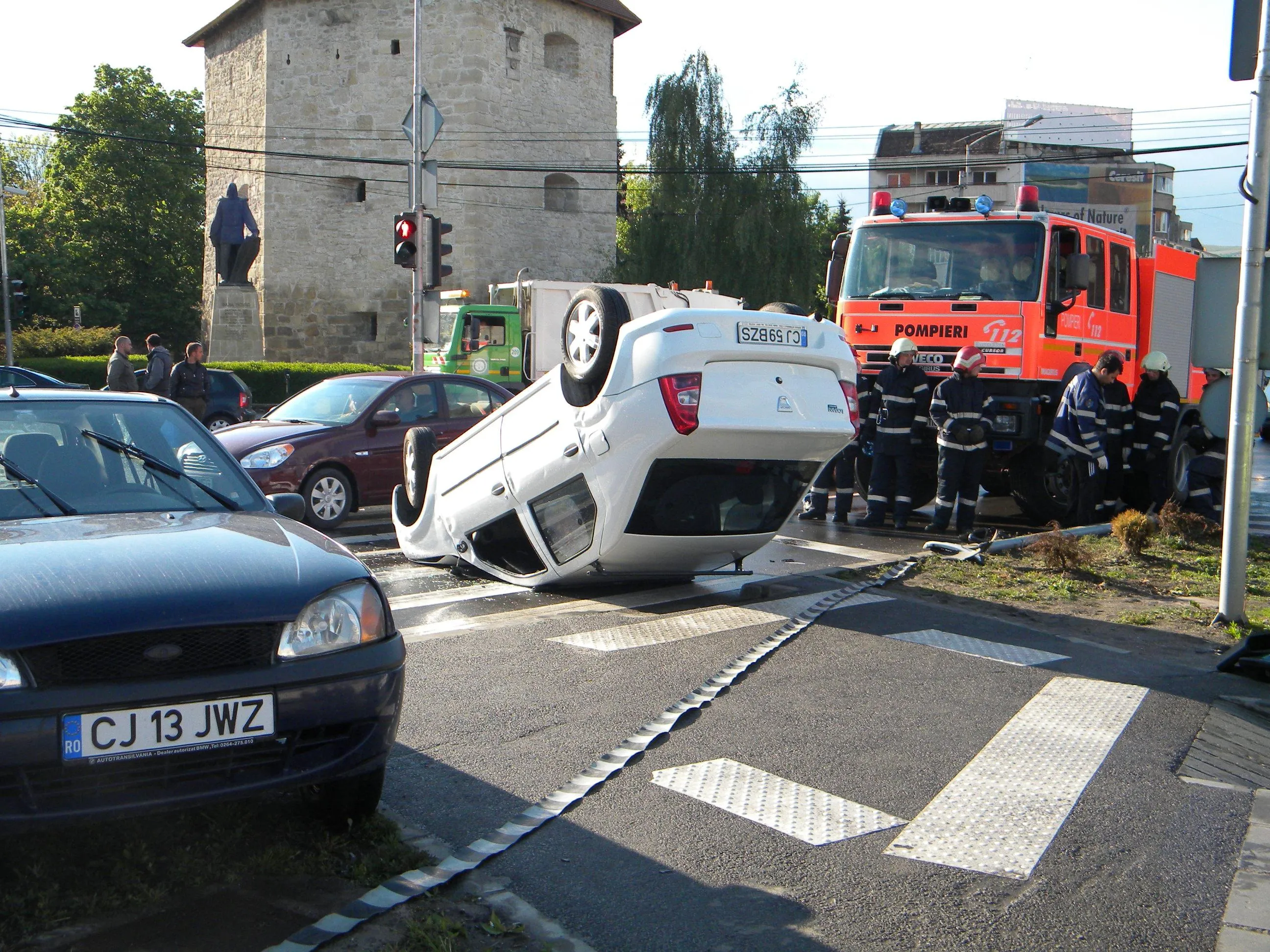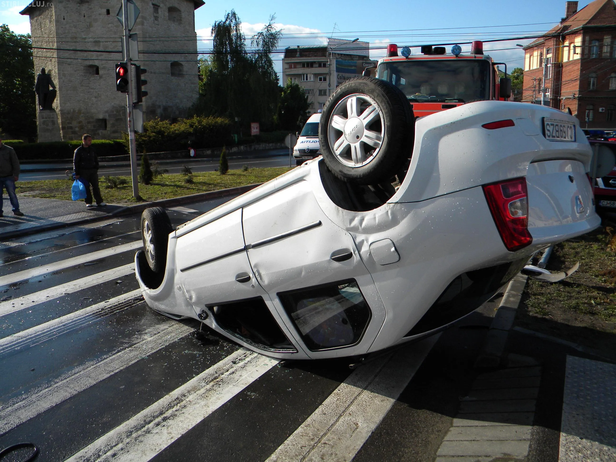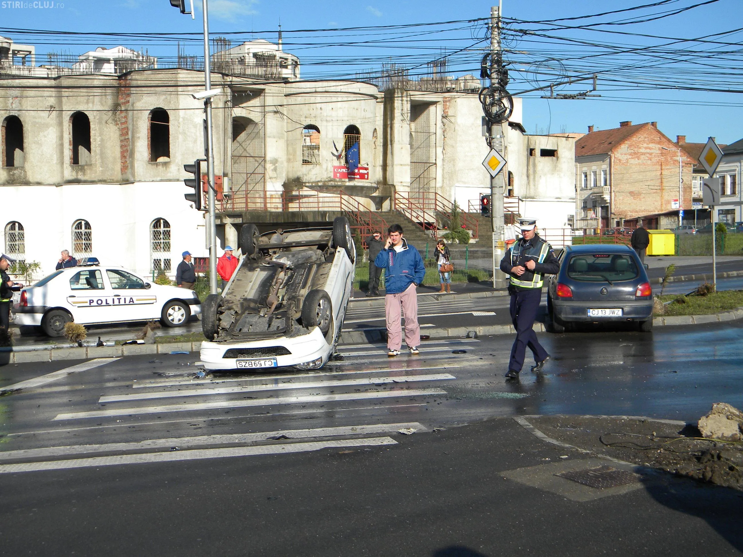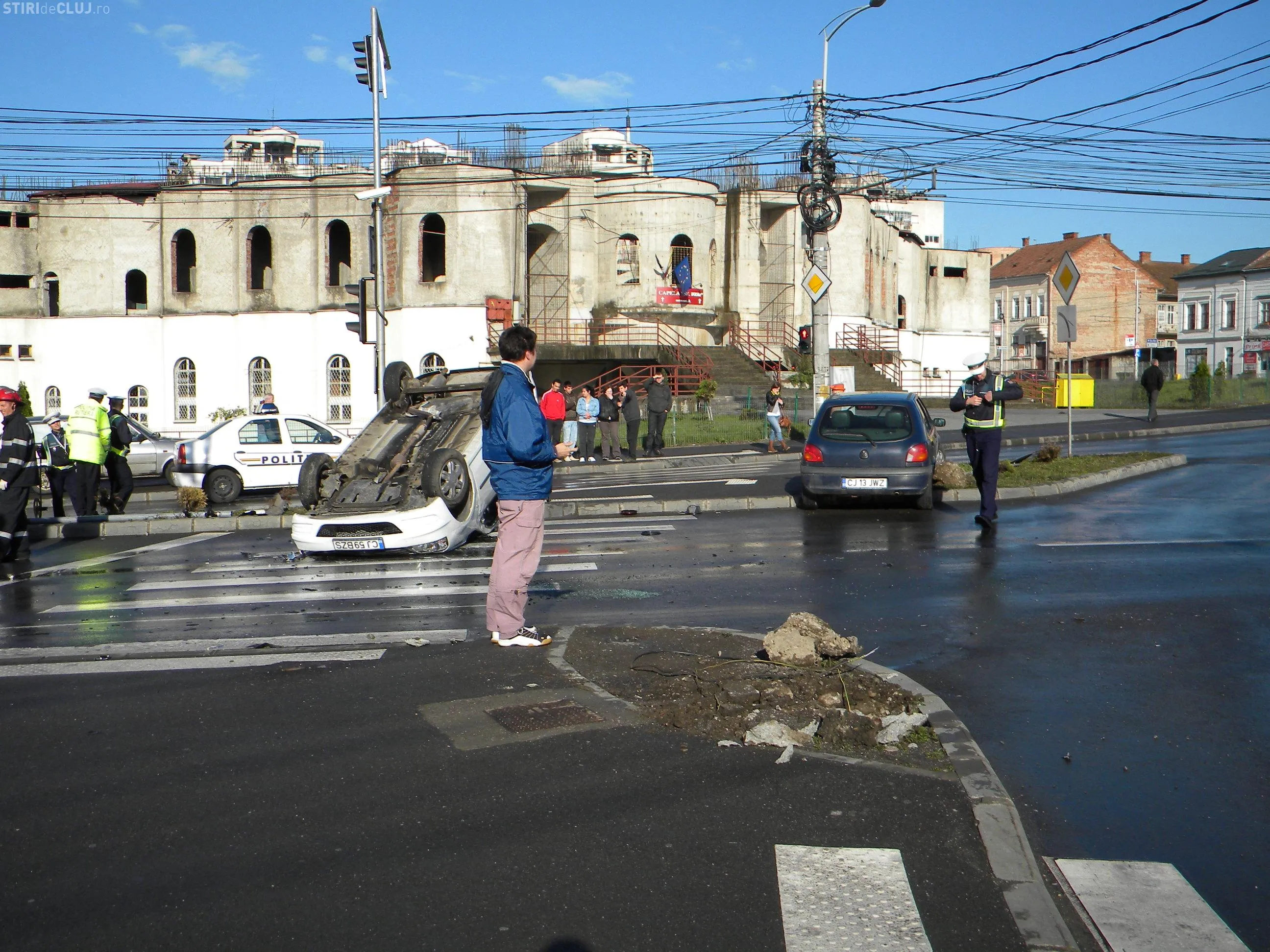 Doua masini au fost implicate intr-un spectaculos accident produs in jurul orei 18.00 in Piata Baba Novac. Una dintre masini s-a rasturnat si a spulberat un semafor. O persoana a fost ranita.