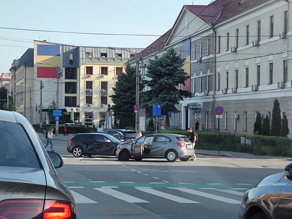 Un șofer circula dinspre Bulevardul Nicolae Titulescu și s-a tamponat cu un conducător auto care ieșise de pe strada General Traian Moșoiu.