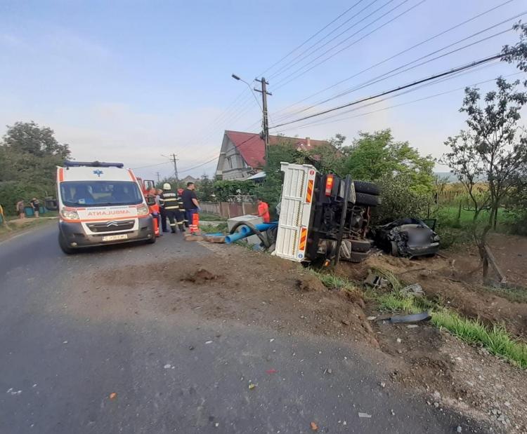 „O autospecială cu modul de descarcerare a fost alertată în jurul orei 7.10, iar în momentul sosirii la fața locului, echipajul acesteia a găsit un autocamion răsturnat și un autoturism avariat în afara părții carosabile. Un echipaj SAJ, dislocat la locul accidentului, a consultat șoferul autocamionului, care prezenta afecțiuni ușoare, fără a-l transporta la spital.”, anunță ISU Cluj.