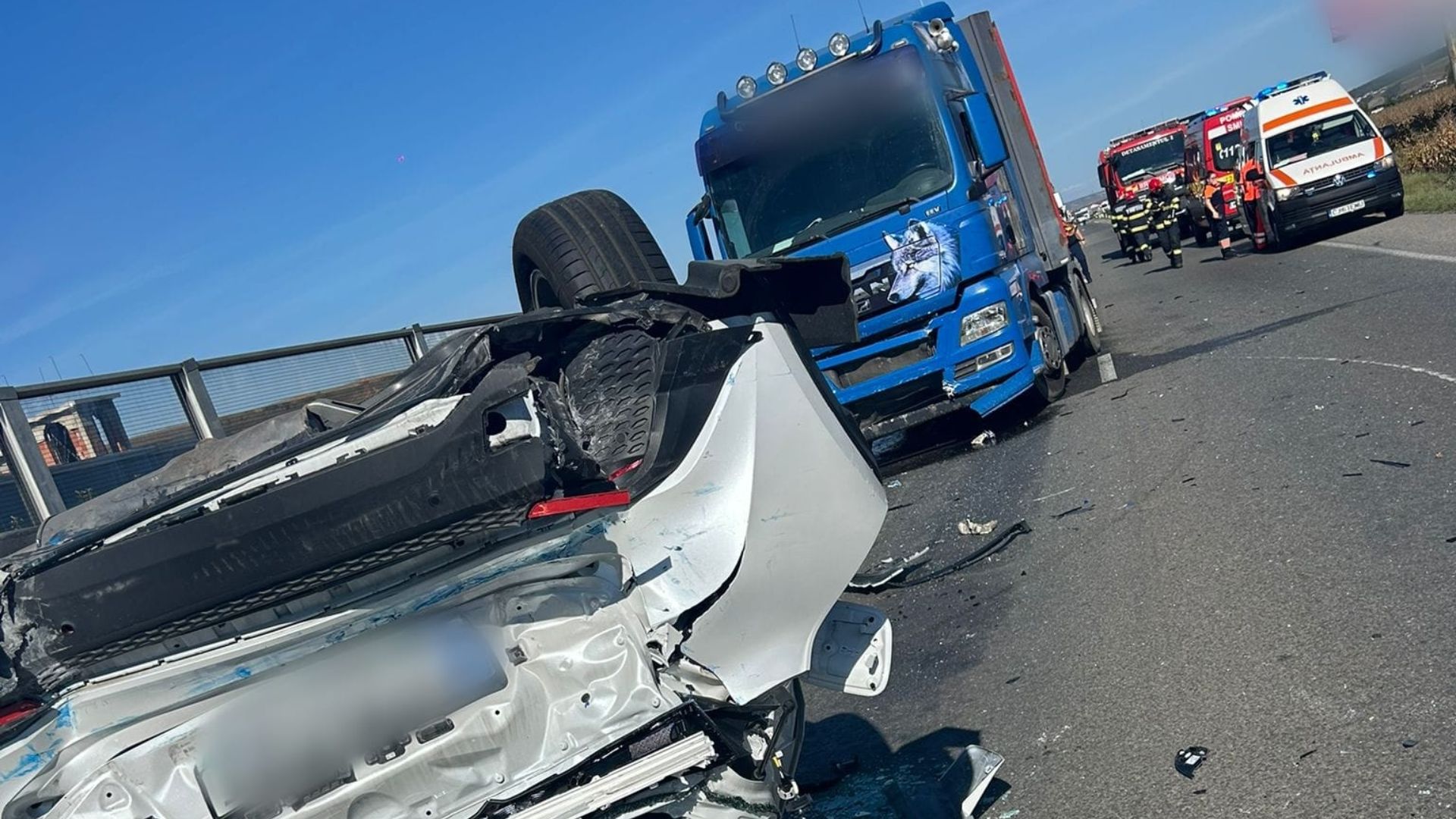 Accident incredibil produs în Cluj: Un tir și două mașini, implicate în impact. Una dintre ele s-a răsturnat pe drum. O femeie a ajuns la spital FOTO