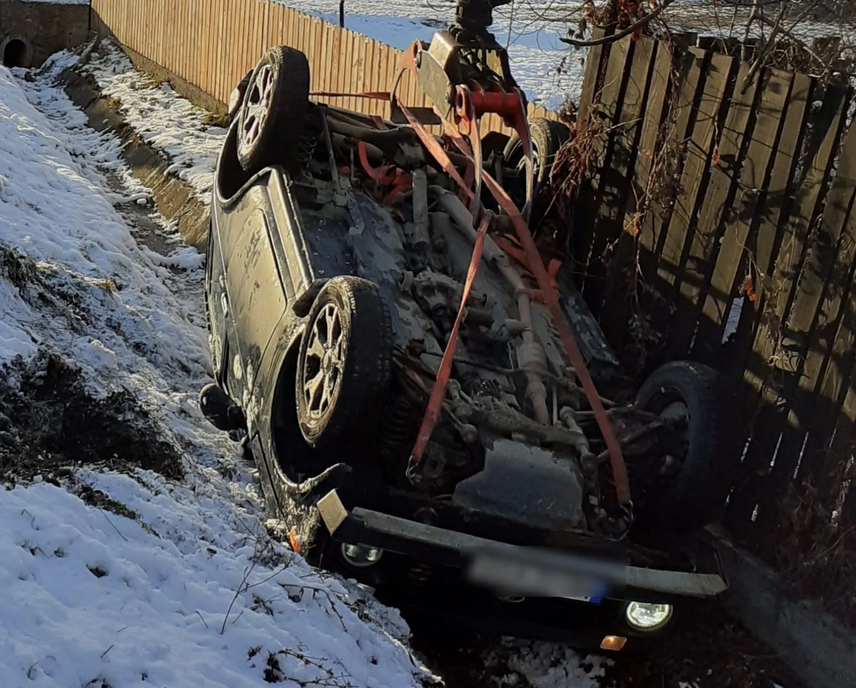 O mașină s-a răsturnat într-un șanț, în urma unui accident rutier petrecut sâmbătă, 11 ianuarie, în localitatea Vânători, județul Cluj.