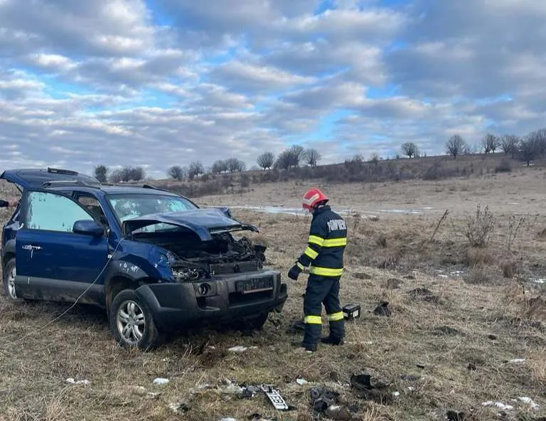 Accident între localitățile Aghireșu și Petrindu! Un șofer a ajuns cu mașina pe câmp - FOTO