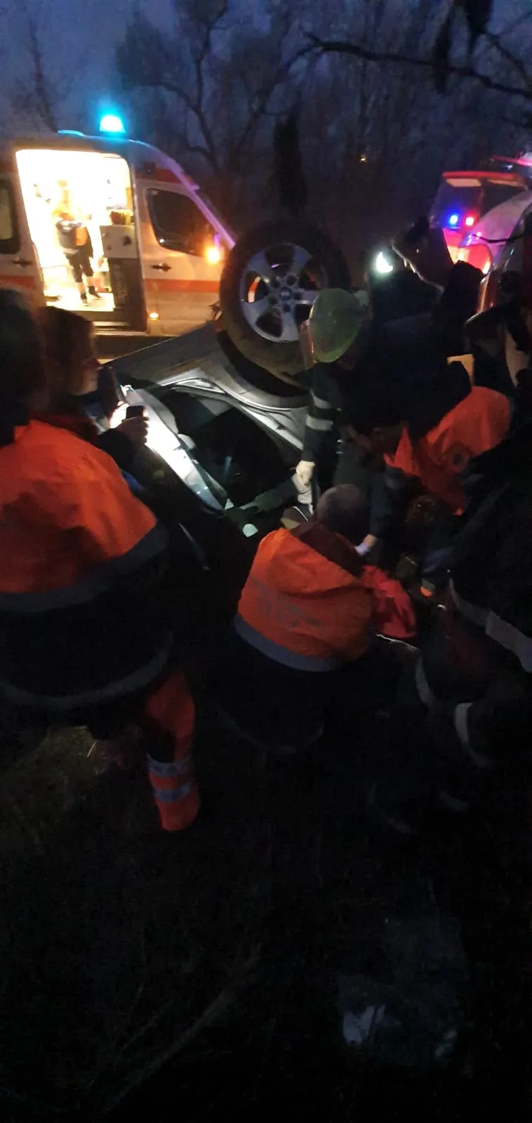 Pompierii au găsit mașina răsturnată pe plafon, în șanțul de lână partea carosabilă, și un bărbat, de circa 40 de ani, blocat în aceasta.