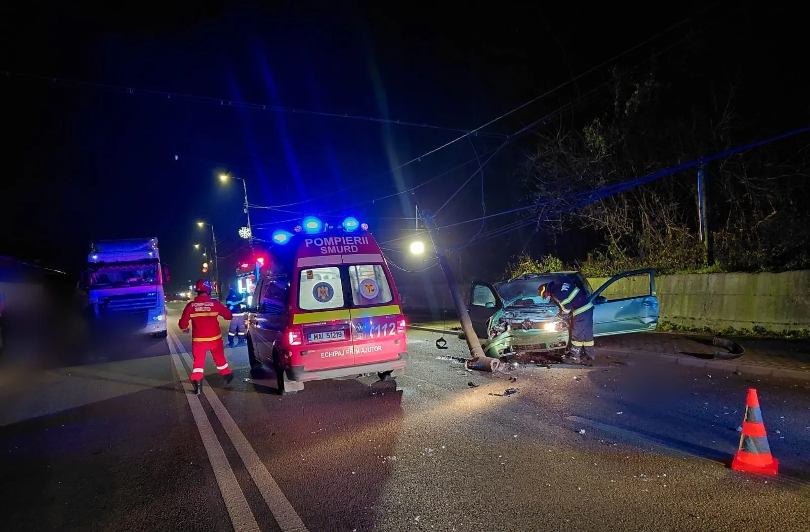 Au fost trimise la locul accidentului o autospecială cu modul de descarcerare, o ambulanță SMURD și un echipaj SAJ.