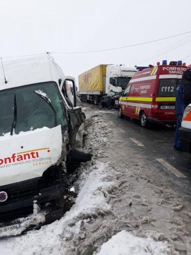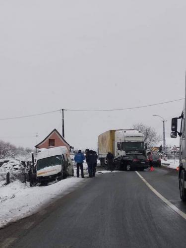 Șoferul unui autoturism nu a adaptat viteza la condițiile de drum într-o curbă și a pătruns pe contrasens, unde a lovit o autoutilitară, fiind apoi priectat într-un TIR.