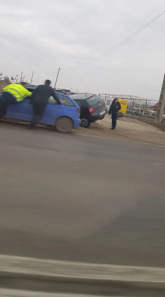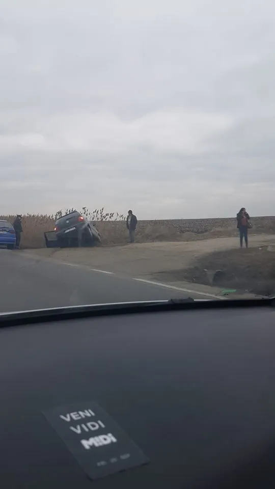 Din primele informații, un șofer a ajuns cu mașina în afara părții carosabile, aproape răsturnându-se.