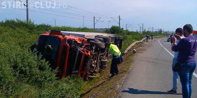 TIR -ul s-a răsturnat pe marginea drumului, după ce șoferul a tras de volan pentru a atenua șocul.