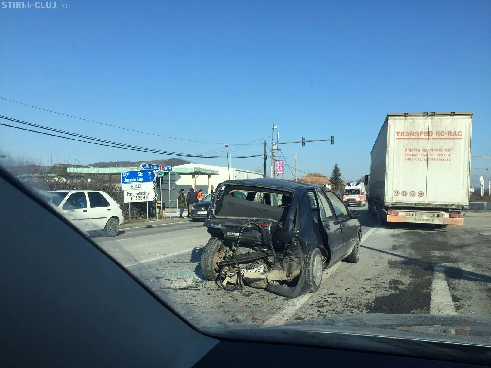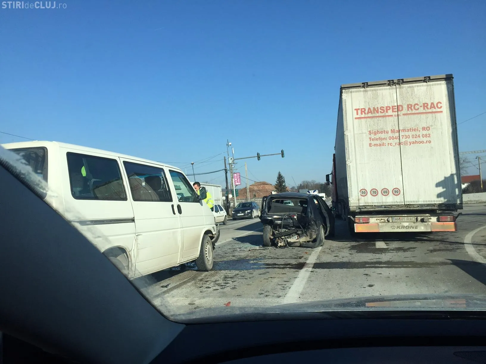 Un şofer care circula dinspre Cluj-Napoca spre Gherla a lovit în plin o mașină cu numere de Maramureș, care se oprise la semaforul de la intersecția cu drumul spre Tetarom.