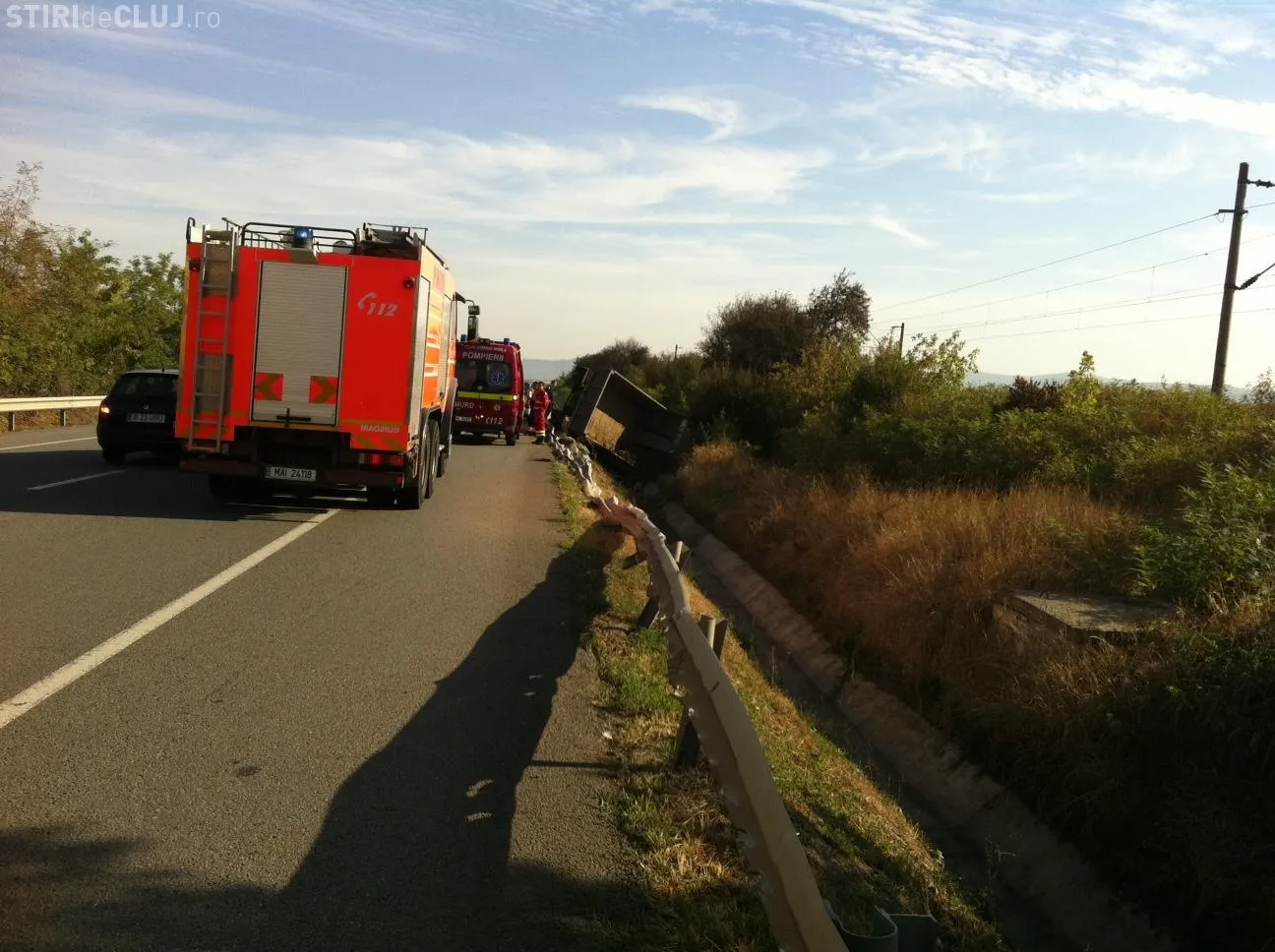 ACCIDENT la JUCU: Un bărbat şi un copil, răniţi după ce autobasculanta în care se aflau S-A RĂSTURNAT - FOTO VIDEO