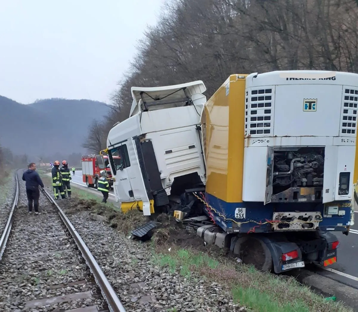 Compania care deține camionul întreprinde măsuri pentru scoaterea acestuia din poziția respectivă. Traficul este restricționat pe un sens, iar traficul feroviar de pe linia din apropiere nu a fost afectat.