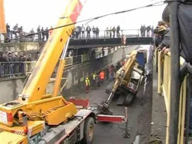 Bratul excavatorului a agatat o traversa din metal care sustine podul si o bucata de beton s-a desprins si a cazut peste femeia care trecea prin pasaj. Victima a fost strivita si a murit pe loc.