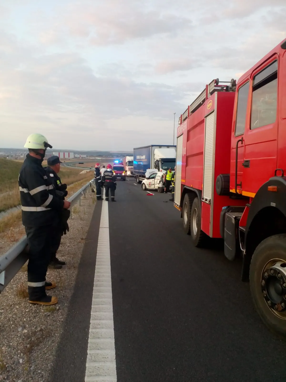 Pompierii sosiți de urgență la locul accidentului au găsit un autoturism și un autotren avariate, iar ocupanții autovehiculelor ieșiți din acestea.