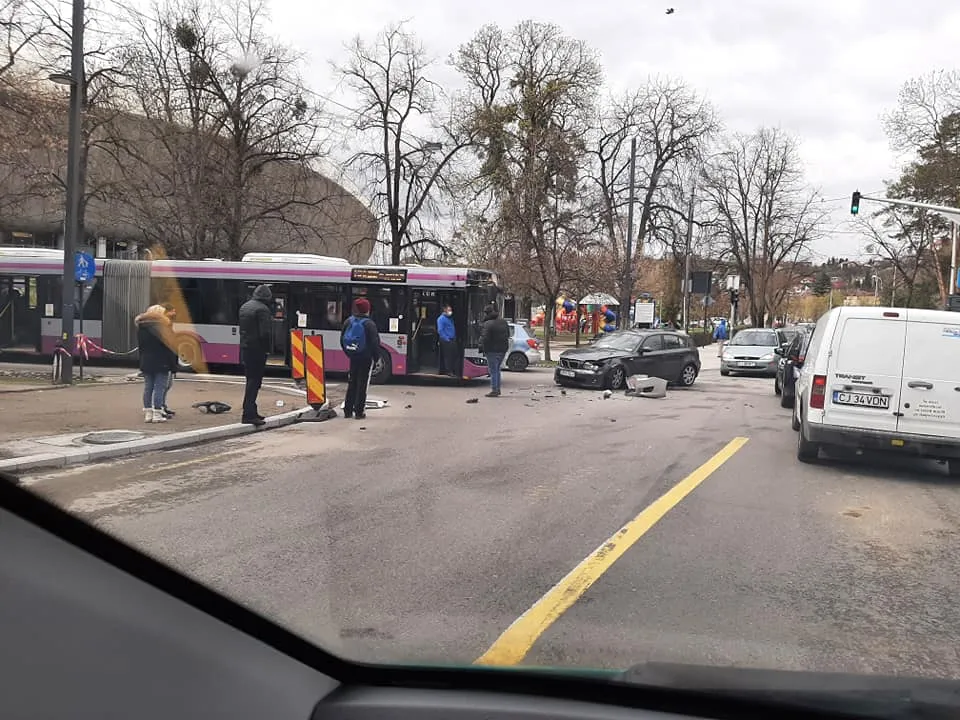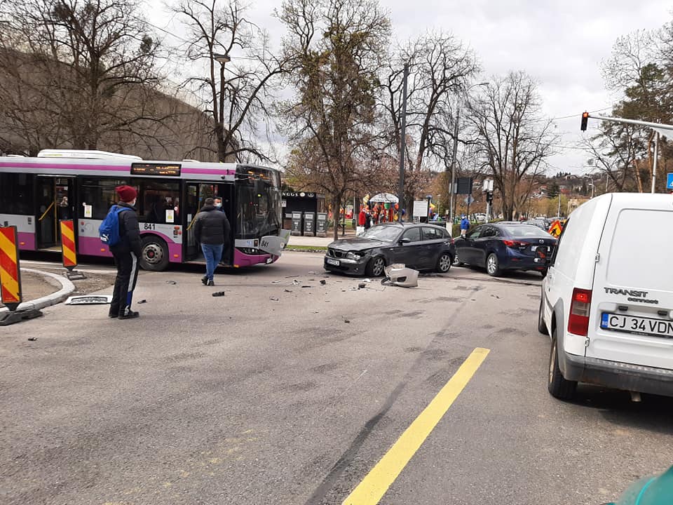Un BMW a lovit un autoturism și un autobuz, pe Aleea Stadion din Cluj-Napoca.