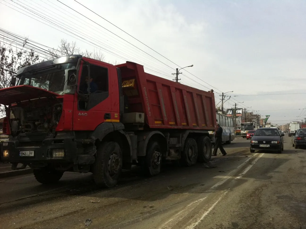 Potrivit martorilor, o autobasculantă de culoare roșie a oprit la semafor, iar autobasculantă de culoare albă a pierdut controlul asupra volanului și a intrat într-o casă.