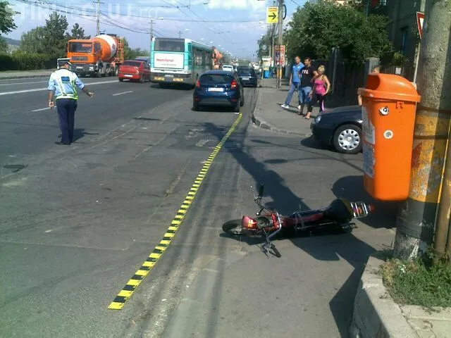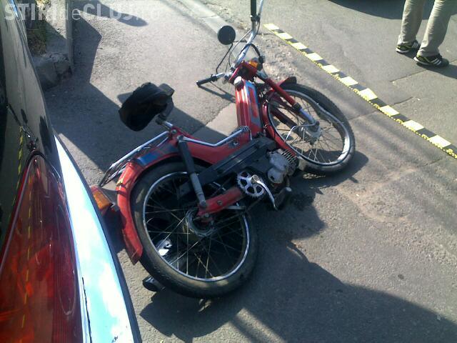 Motoreta a fost lovită de un autoturism marca Ford, cu numere de București. Conducătorul autovehiculului pe două roți a fost rănit, primind îngrijiri medicale.