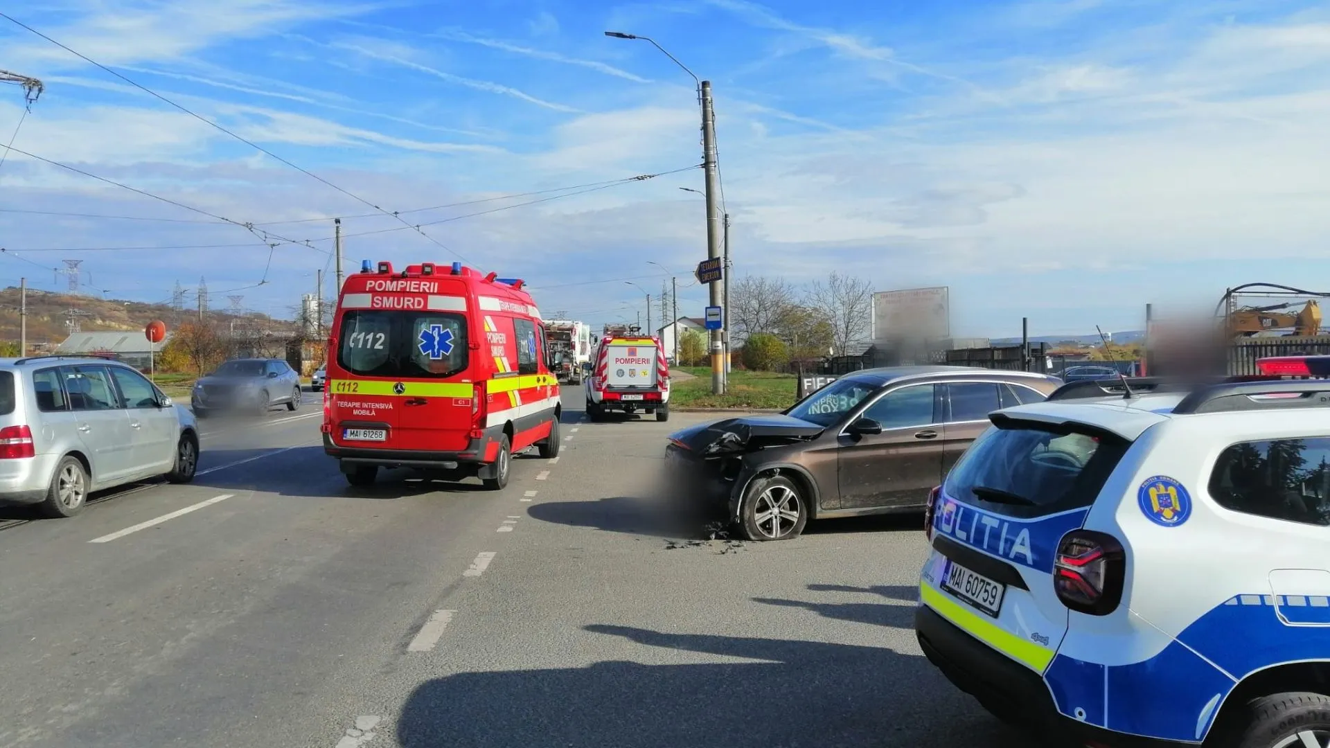 La fața locului au fost trimise două autospeciale cu modul de descarcerare și o ambulanță SMURD, care au ajuns în doar câteva minute pentru a evalua situația. Potrivit primelor informații, în accident a fost implicat un singur autoturism, iar circulația în zonă s-a desfășurat îngreunat pe durata intervenției.