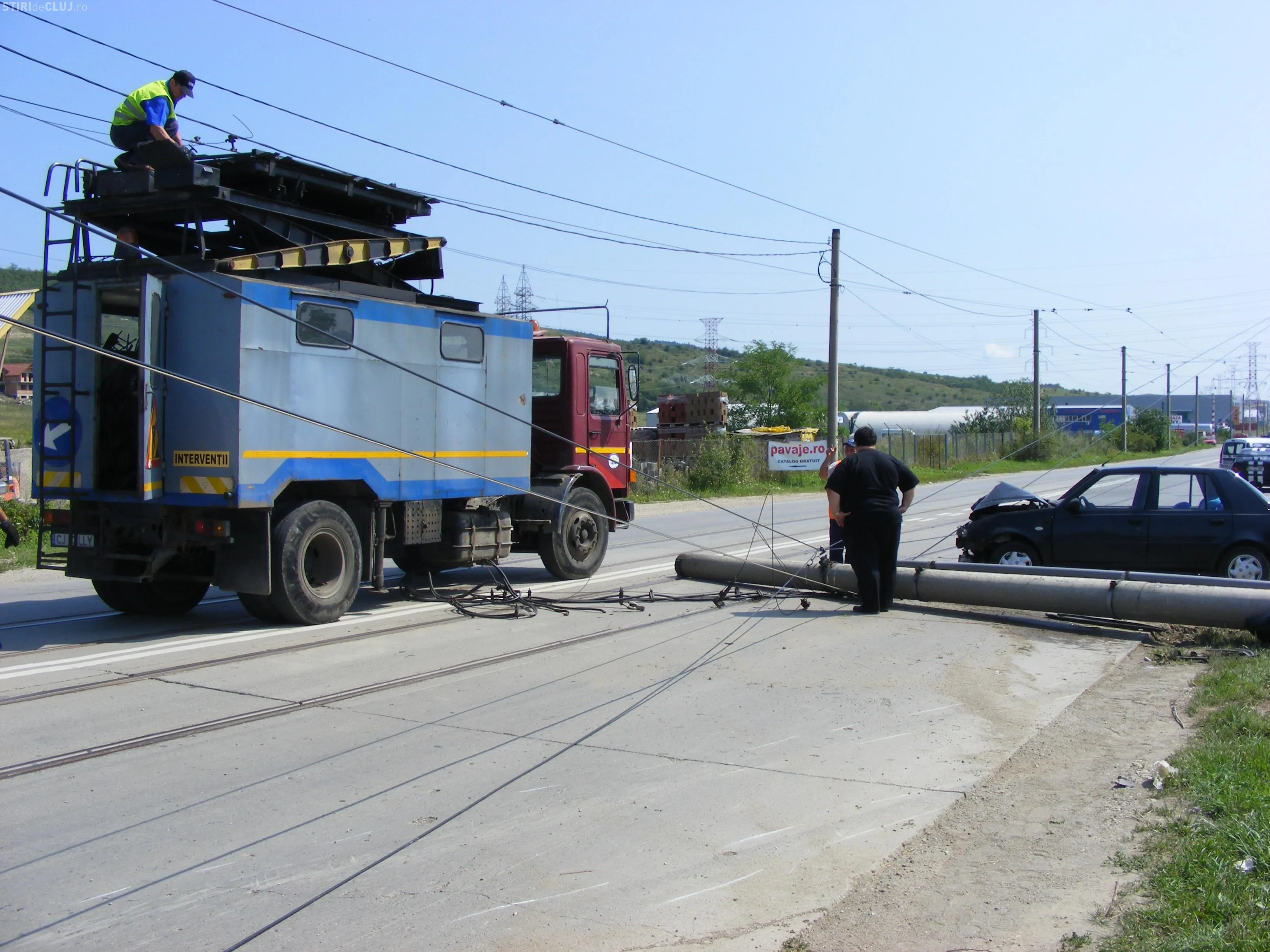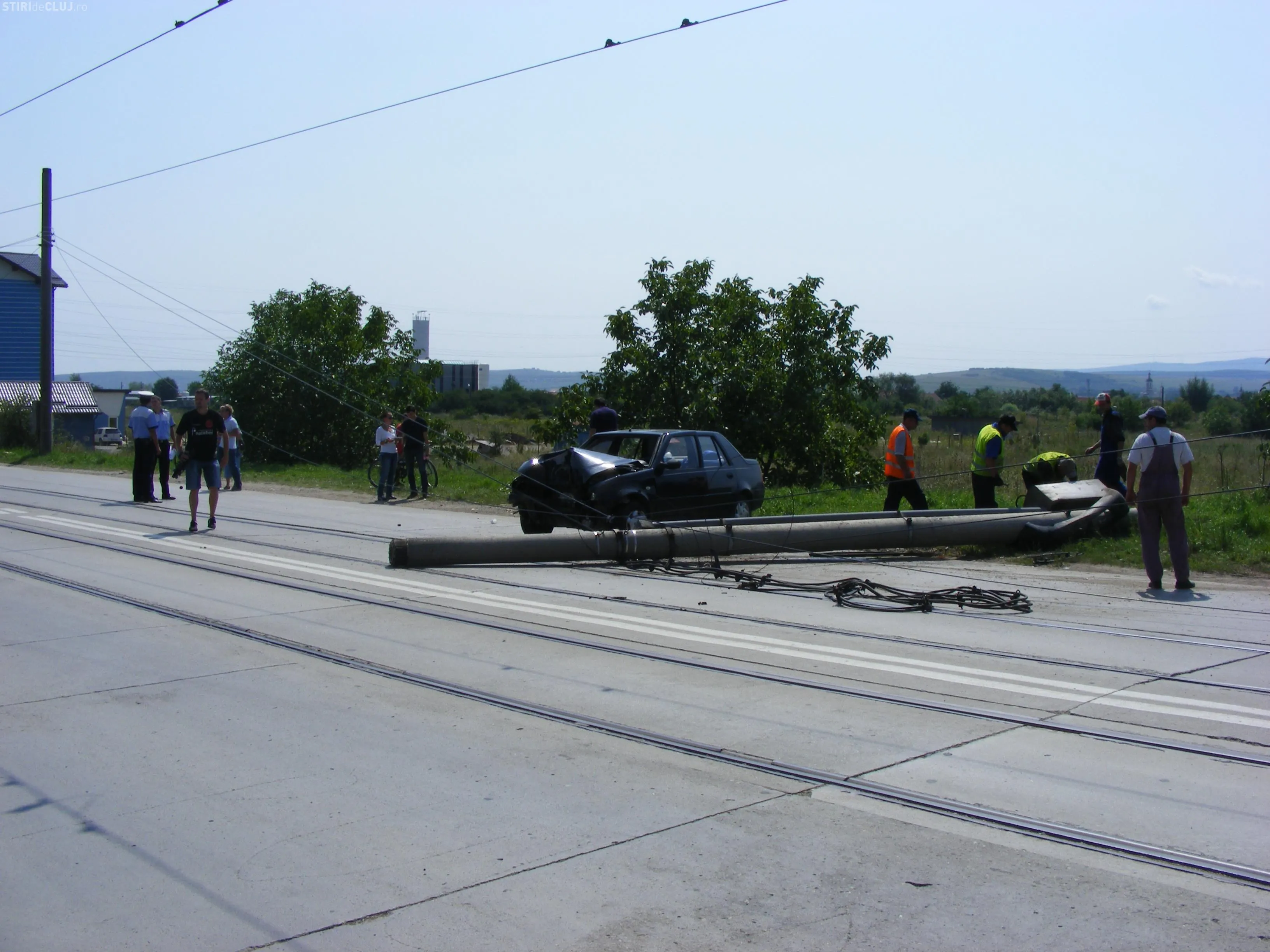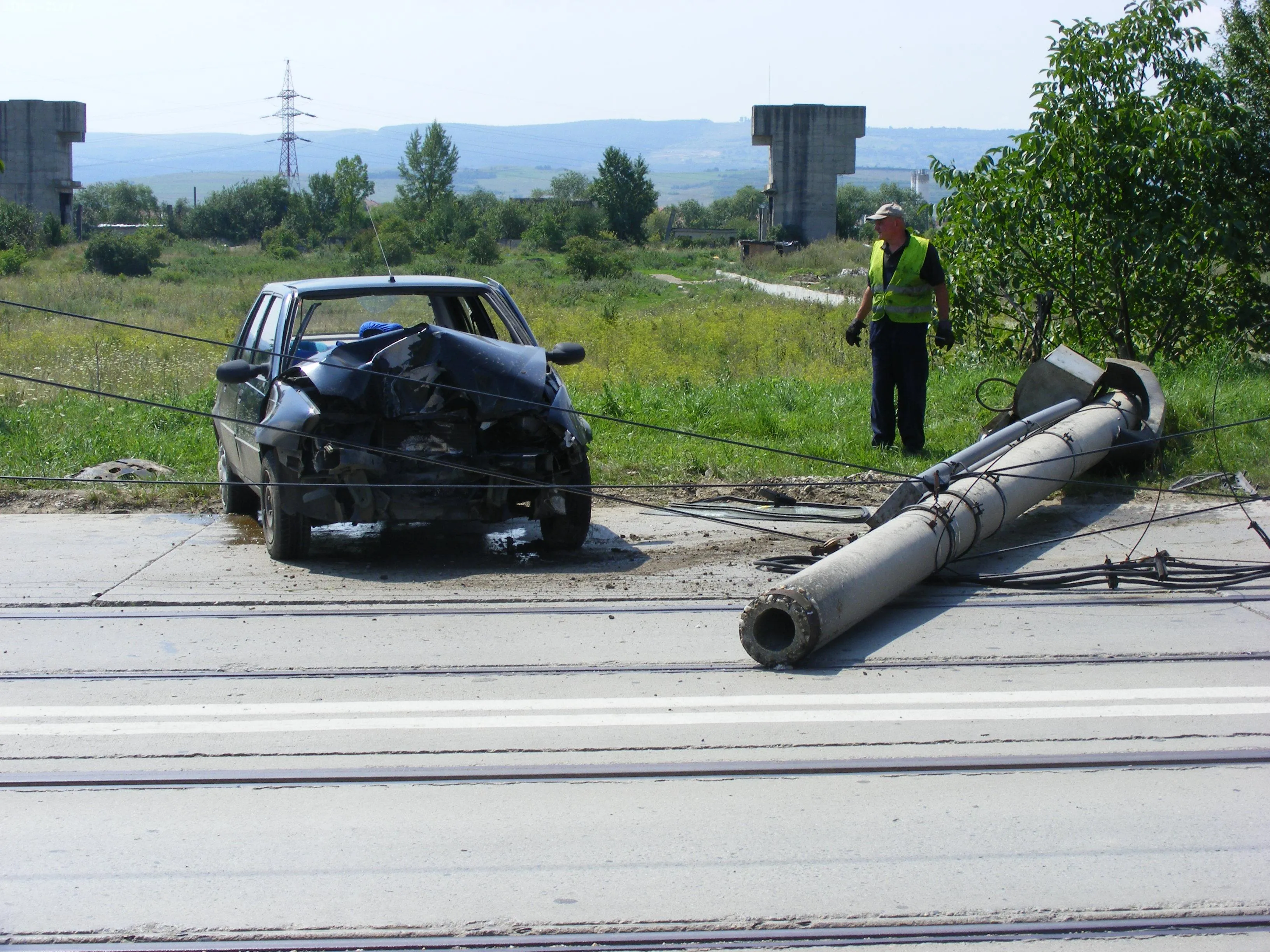 Asa a intrat intr-un stalp. Masina in care se aflau soferul, sotia insarcinata si fetita de trei ani, o Dacia Solenza a daramat stalpul de sustinere a liniei de tramvai.