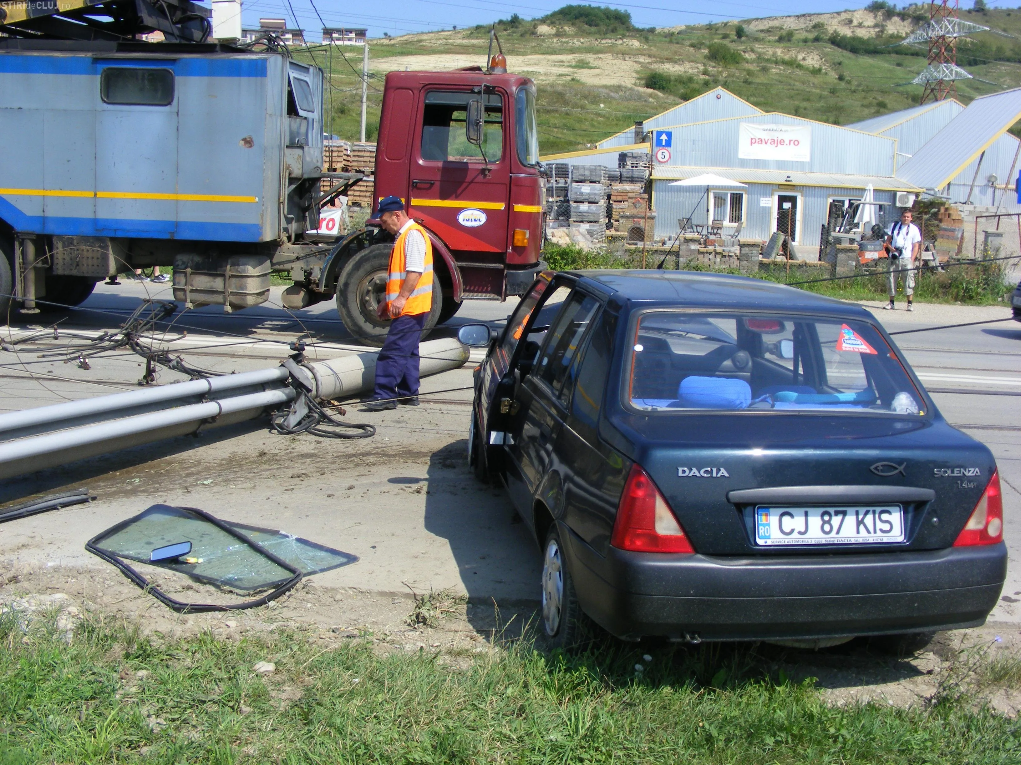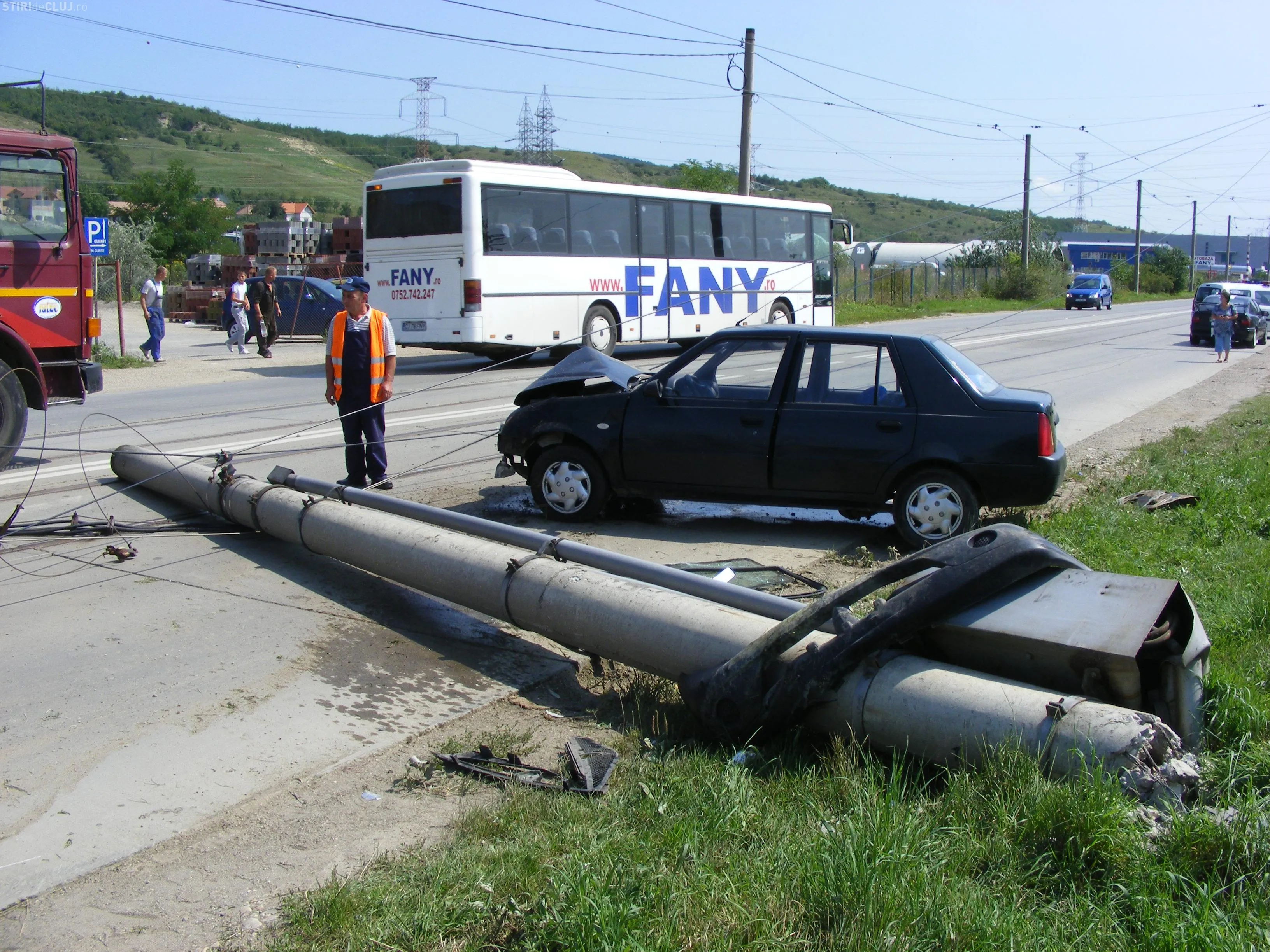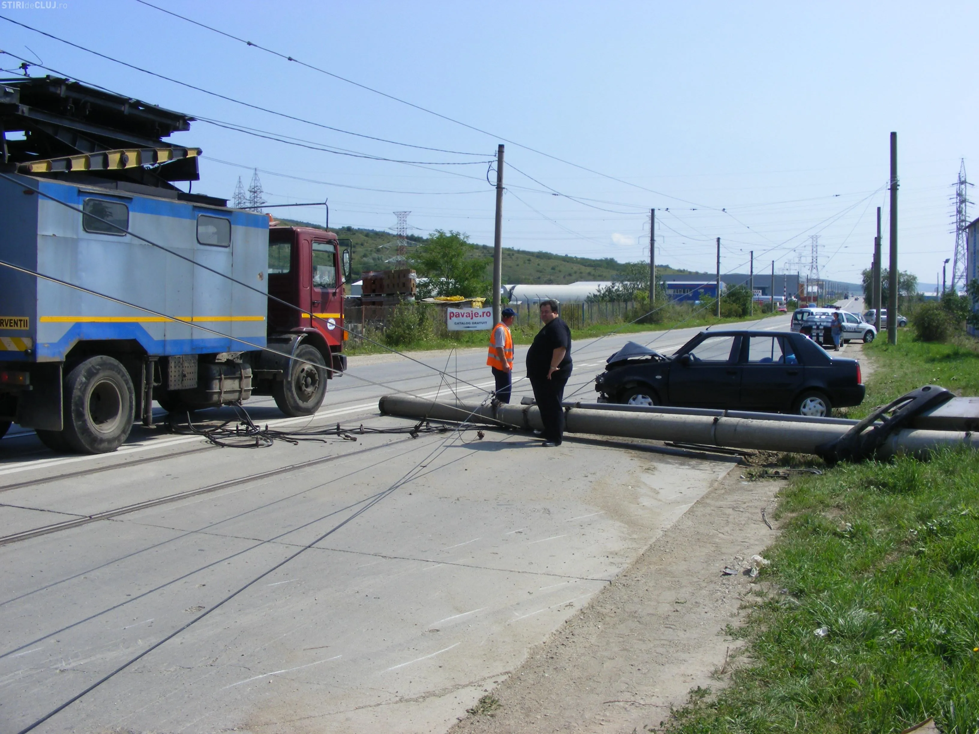 Asa a intrat intr-un stalp. Masina in care se aflau soferul, sotia insarcinata si fetita de trei ani, o Dacia Solenza a daramat stalpul de sustinere a liniei de tramvai.