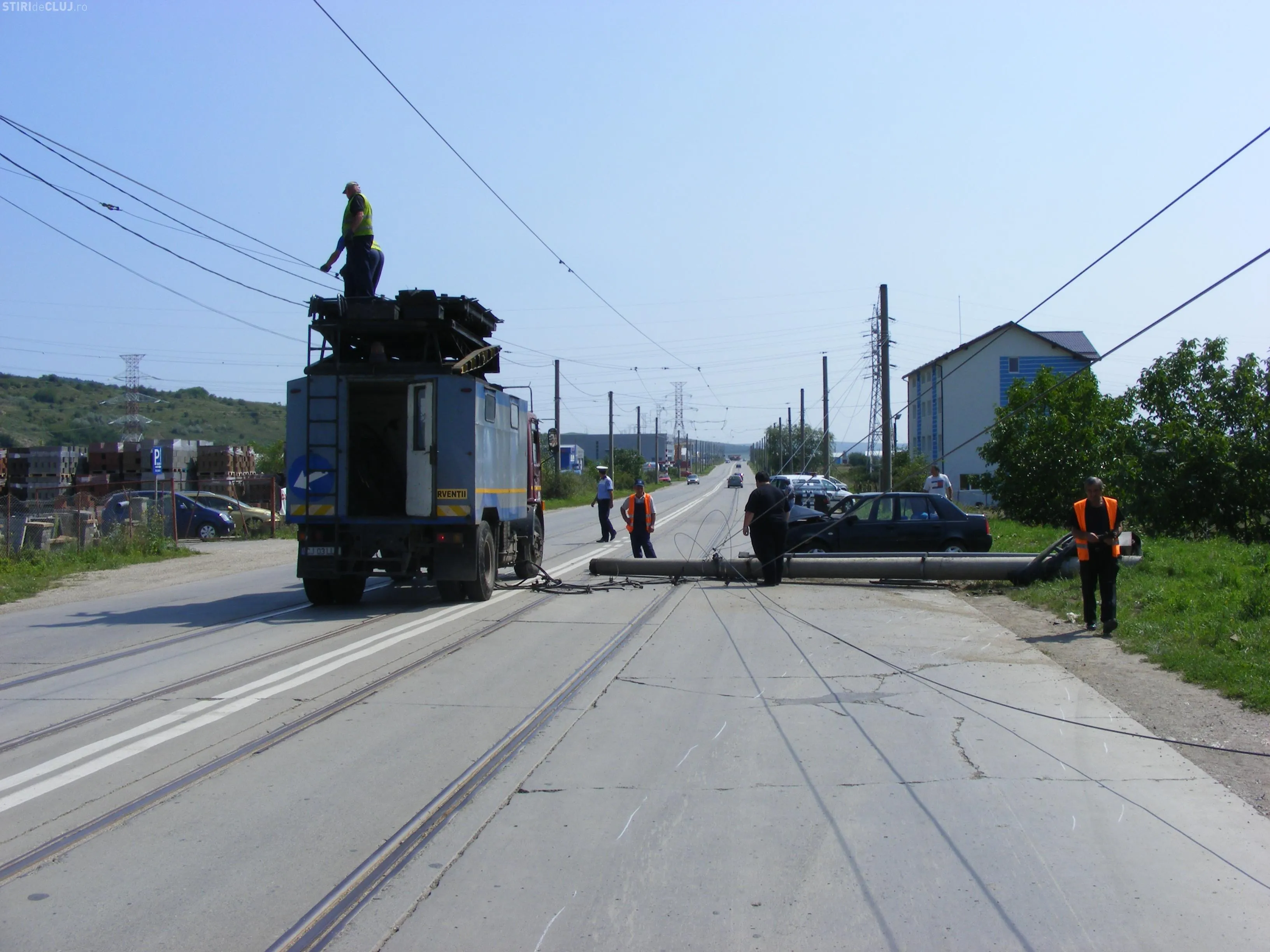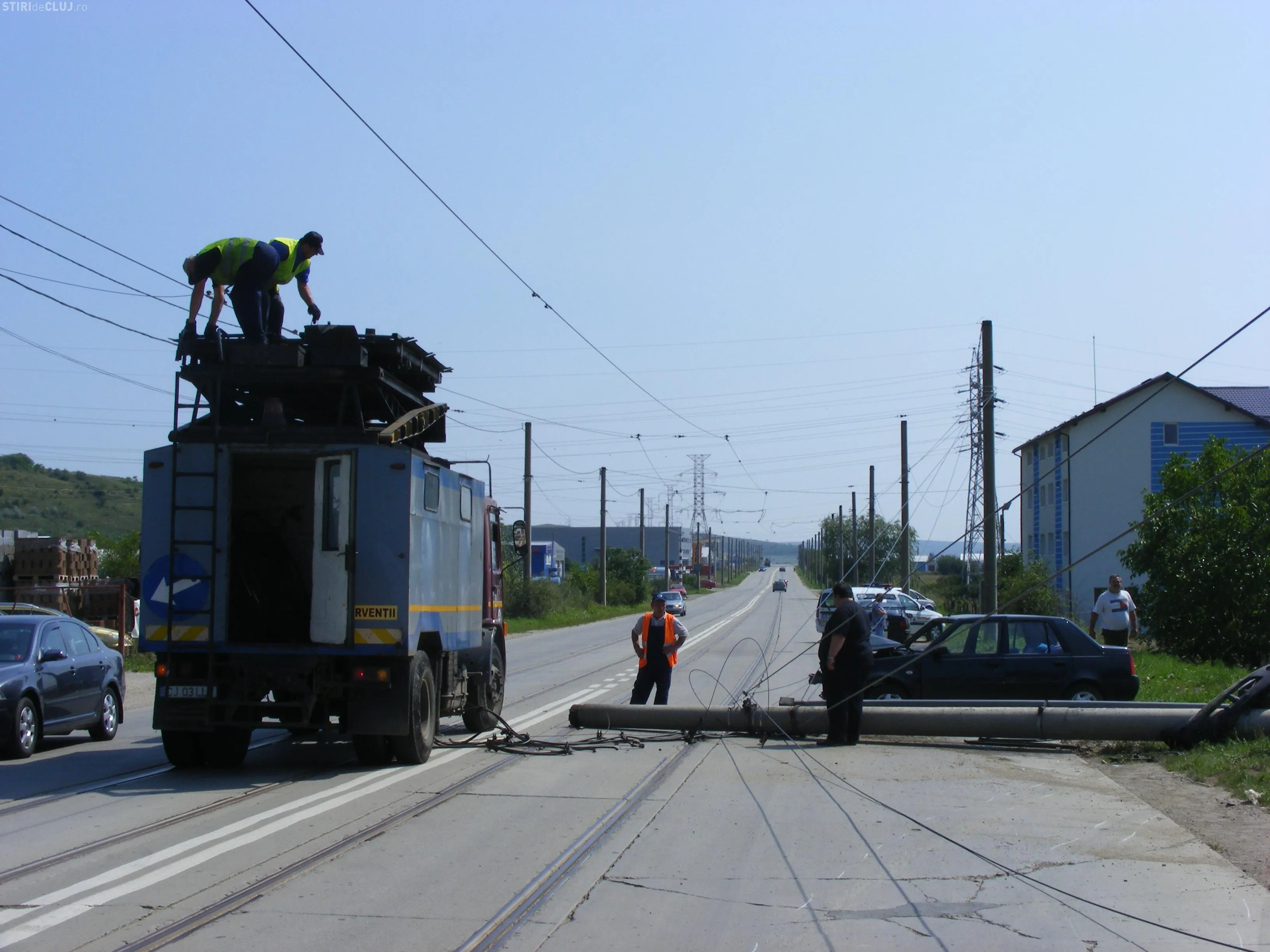 Accident pe B-dul Muncii! O femeie insarcinata a ramas incarcerata. Stalpul de sustinere a liniei de tramvai a fost daramat! VIDEO IMAGINI SOCANTE