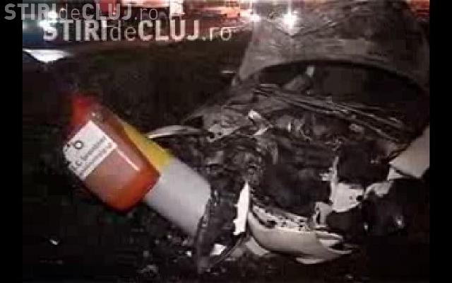 Accident pe Calea Turzii din Cluj. Un Peugeot a luat foc dupa ce a doborat un stalp de electricitate si unul de telefonie - VIDEO