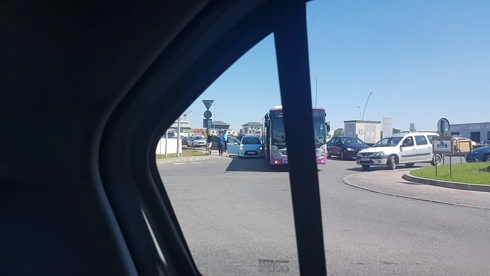 În sensul giratoriu a intrat un autobuz, dar și un mic autoturism condus de un șofer extrem de derutat probabil de traficul intens.