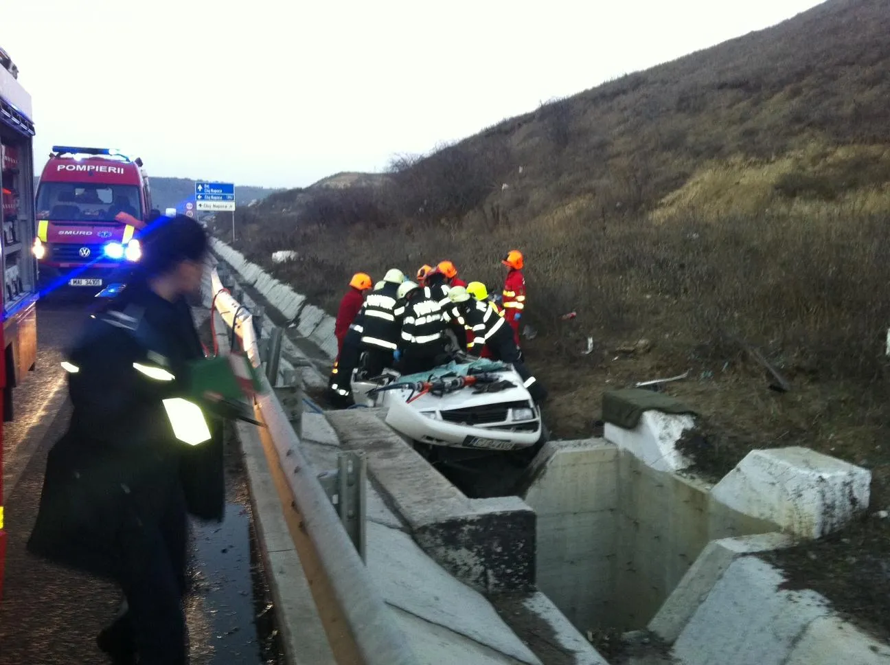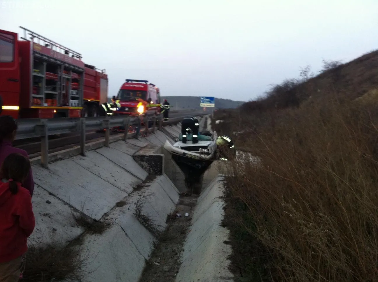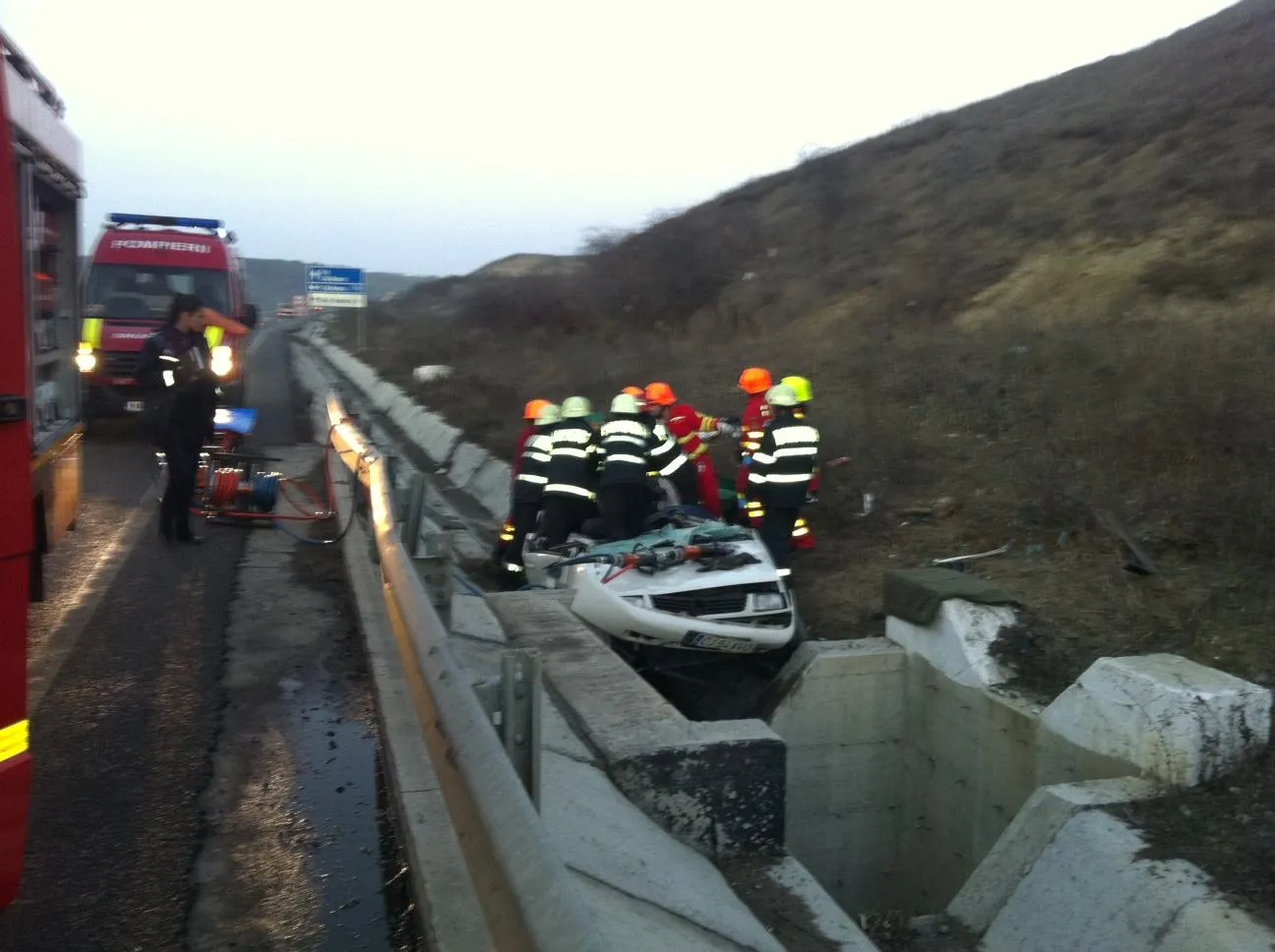 Conform polițiștilor, șoferul unu VW care circula dinspre Vâlcele spre Apahida a abordat cu viteză o curbă la dreapta, a ajuns pe contrasens unde s-a rotit de câteva ori, după care a plonjat în șanțul de beton de pe marginea centurii ocolitoare a Clujului.
