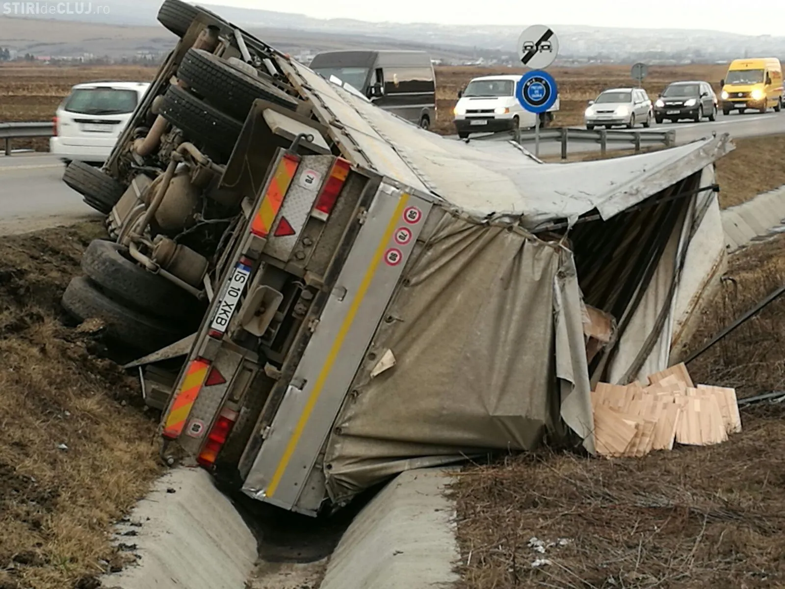 Accident pe centura Vâlcele-Apahida. Un TIR plin cu paleți de lemn s-a răsturnat în șanț FOTO