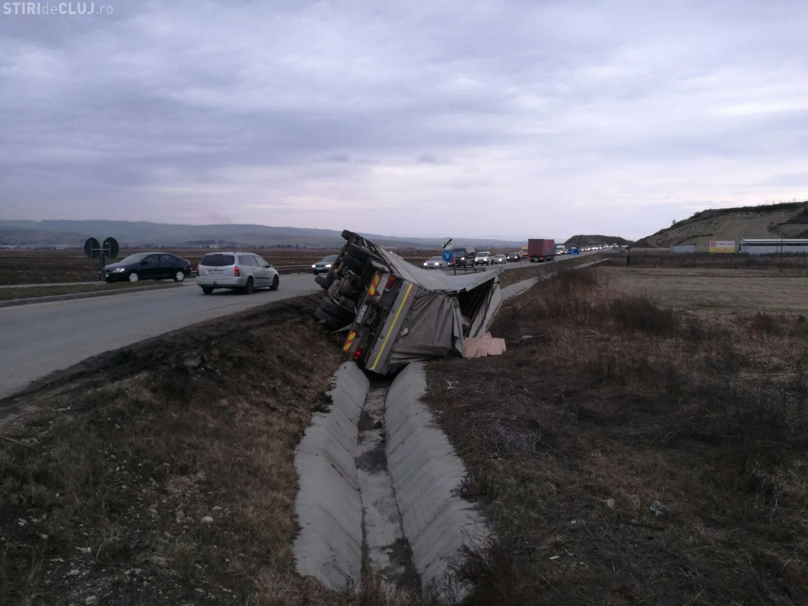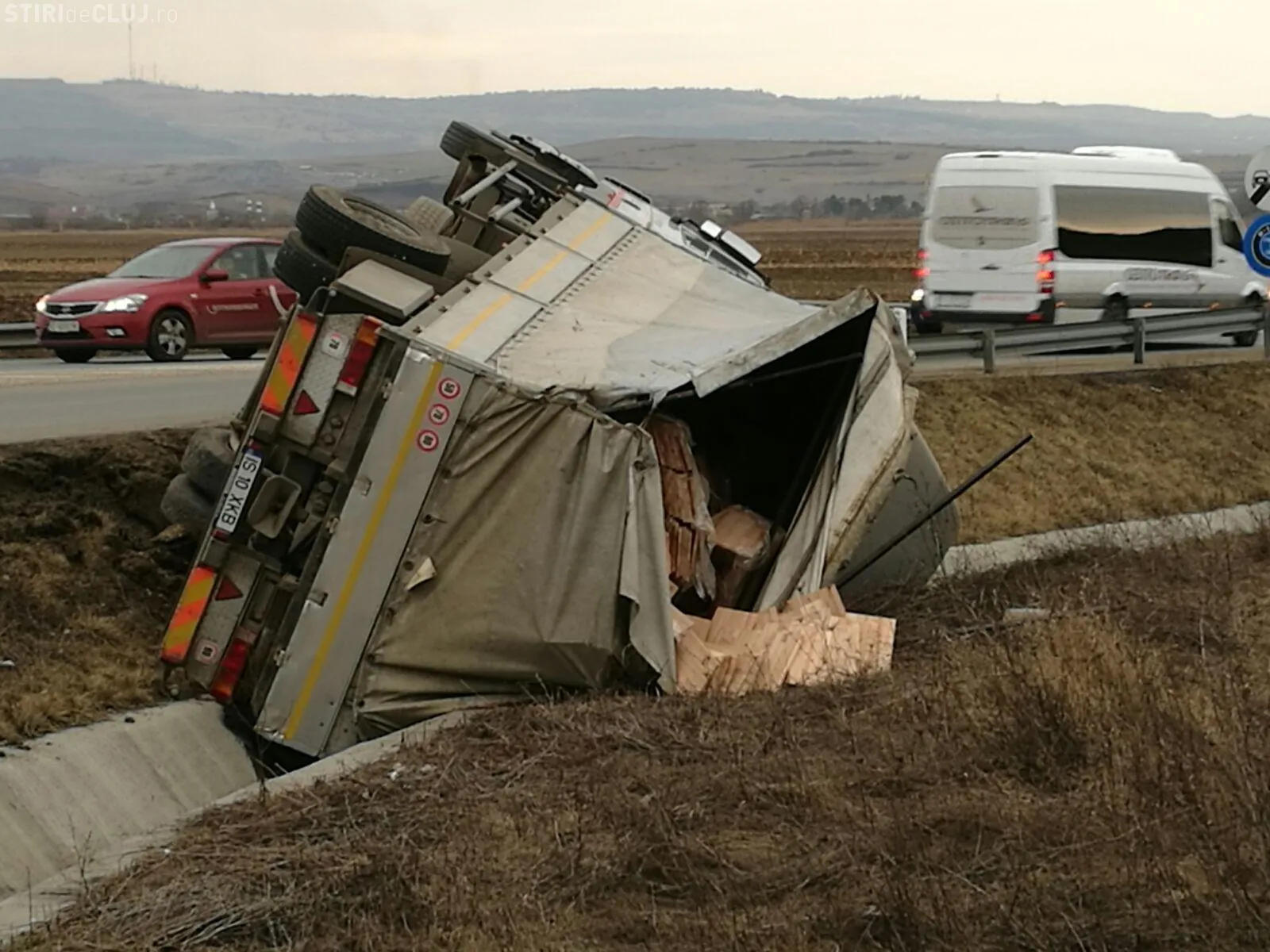 Un accident rutier a avut loc, vineir după-amiază, pe centura Vâlcele-Apahida, unde un TIR s-a răsturnat pe marginea drumului.