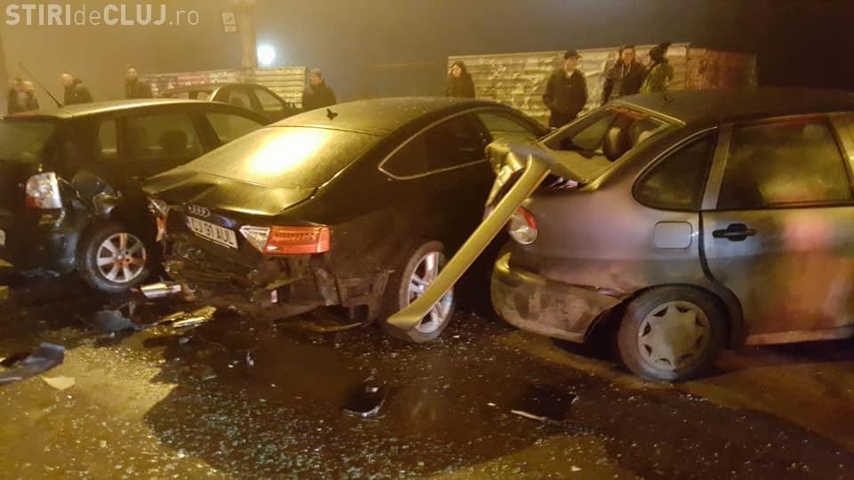 ”În jurul orei 23.50, un tânăr în vârstă de 19 ani din Zalău, pe fondul neadaptării vitezei la condițiile de drum a pierdut controlul asupra direcției de deplasare și a intrat în coliziune cu 6 autovehicule parcate. Accidentul s-a soldat doar cu pagube materiale. Șoferul a fost testat cu aparatul etilotest, rezultatul fiind negativ”, a precizat Poliția Cluj.