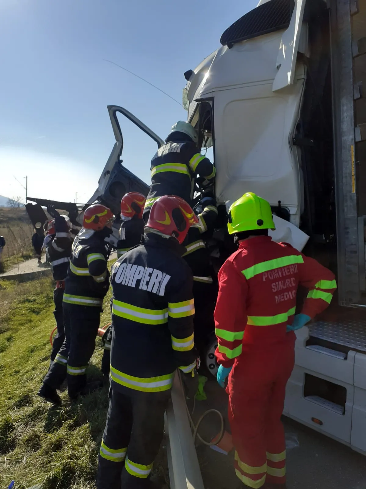 Pompierii au fost alertați în jurul orei 14.30, iar, în momentul sosirii la fața locului, au găsit unul dintre șoferi încarcerat în cabină, iar cel pe cel de-al doilea în imposibilitatea de a ieși singur din autovehicul.